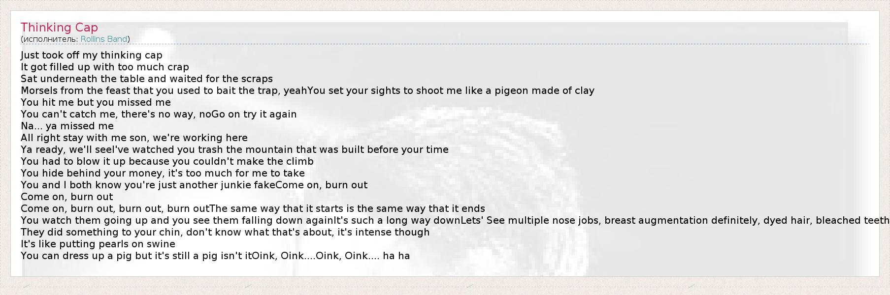 Just took off my thinking cap It got filled up with too much crap Sat underneath the table and waited for the scraps Morsels from the feast that you used to bait the trap, yeahYou set your sights to shoot me like a pigeon made of clay You hit me but you missed me You can't catch me, there's no way, noGo on try it again Na... ya missed me All right stay with me son, we're working here Ya ready, we'll seeI've watched you trash the mountain that was built before your time You had to blow it up because you couldn't make the climb You hide behind your money, it's too much for me to take You and I both know you're just another junkie fakeCome on, burn out Come on, burn out Come on, burn out, burn out, burn outThe same way that it starts is the same way that it ends You watch them going up and you see them falling down againIt's such a long way downLets' See multiple nose jobs, breast augmentation definitely, dyed hair, bleached teeth They did something to your chin, don't know what that's about, it's intense though It's like putting pearls on swine You can dress up a pig but it's still a pig isn't itOink, Oink....Oink, Oink.... ha ha