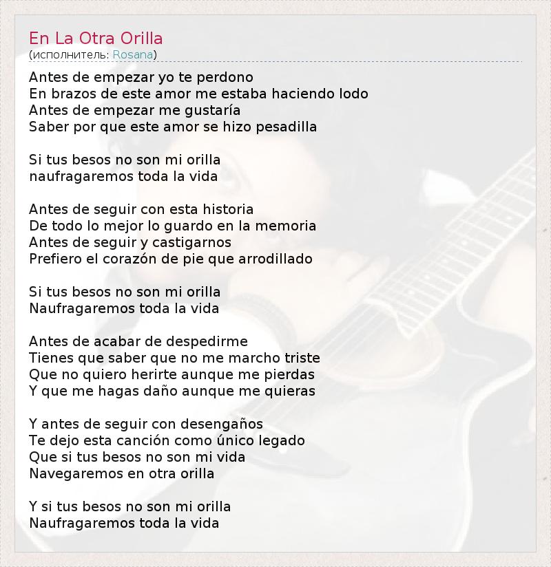 Antes de empezar yo te perdono En brazos de este amor me estaba haciendo lodo Antes de empezar me gustaría Saber por que este amor se hizo pesadilla Si tus besos no son mi orilla naufragaremos toda la vida Antes de seguir con esta historia De todo lo mejor lo guardo en la memoria Antes de seguir y castigarnos Prefiero el corazón de pie que arrodillado Si tus besos no son mi orilla Naufragaremos toda la vida Antes de acabar de despedirme Tienes que saber que no me marcho triste Que no quiero herirte aunque me pierdas Y que me hagas daño aunque me quieras Y antes de seguir con desengaños Te dejo esta canción como único legado Que si tus besos no son mi vida Navegaremos en otra orilla Y si tus besos no son mi orilla Naufragaremos toda la vida