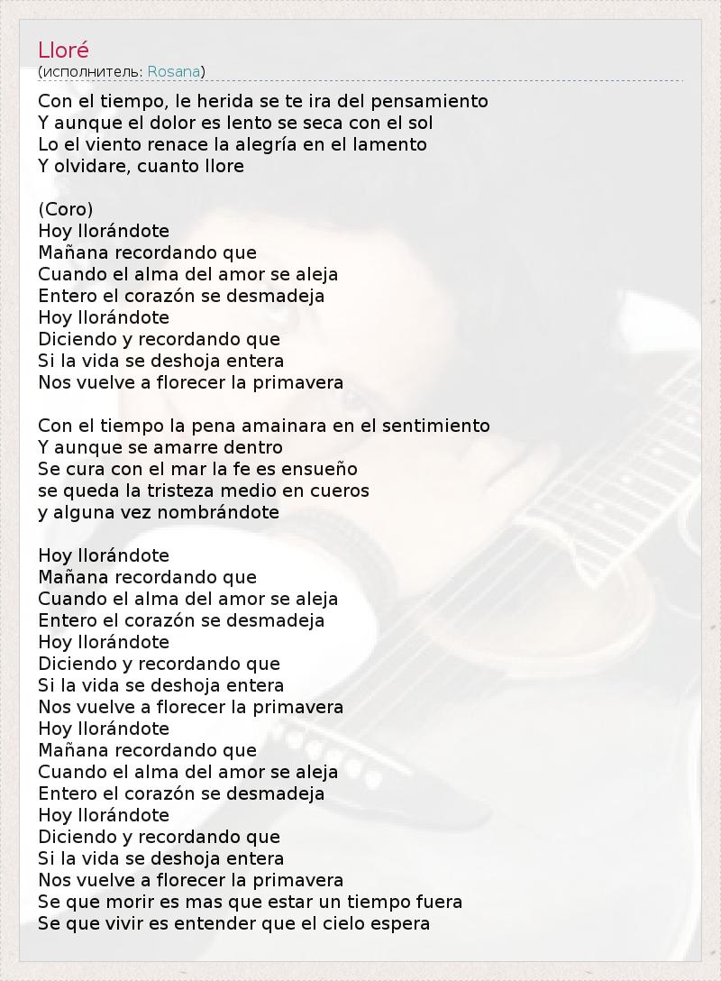 Con el tiempo, le herida se te ira del pensamiento Y aunque el dolor es lento se seca con el sol Lo el viento renace la alegría en el lamento Y olvidare, cuanto llore (Coro) Hoy llorándote Mañana recordando que Cuando el alma del amor se aleja Entero el corazón se desmadeja Hoy llorándote Diciendo y recordando que Si la vida se deshoja entera Nos vuelve a florecer la primavera Con el tiempo la pena amainara en el sentimiento Y aunque se amarre dentro Se cura con el mar la fe es ensueño se queda la tristeza medio en cueros y alguna vez nombrándote Hoy llorándote Mañana recordando que Cuando el alma del amor se aleja Entero el corazón se desmadeja Hoy llorándote Diciendo y recordando que Si la vida se deshoja entera Nos vuelve a florecer la primavera Hoy llorándote Mañana recordando que Cuando el alma del amor se aleja Entero el corazón se desmadeja Hoy llorándote Diciendo y recordando que Si la vida se deshoja entera Nos vuelve a florecer la primavera Se que morir es mas que estar un tiempo fuera Se que vivir es entender que el cielo espera