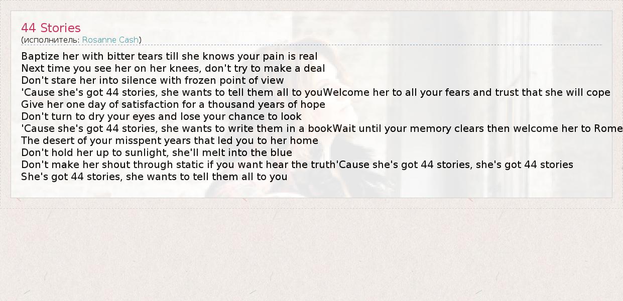 Don't make her shout through static if you want hear the truth'Cause she's got 44 stories, she's got 44 stories