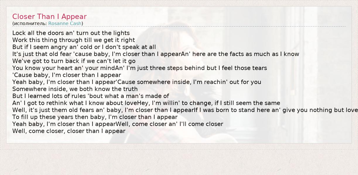 Lock all the doors an' turn out the lights Work this thing through till we get it right But if I seem angry an' cold or I don't speak at all It's just that old fear 'cause baby, I'm closer than I appearAn' here are the facts as much as I know We've got to turn back if we can't let it go You know your heart an' your mindAn' I'm just three steps behind but I feel those tears 'Cause baby, I'm closer than I appear Yeah baby, I'm closer than I appear'Cause somewhere inside, I'm reachin' out for you Somewhere inside, we both know the truth But I learned lots of rules 'bout what a man's made of An' I got to rethink what I know about loveHey, I'm willin' to change, if I still seem the same Well, it's just them old fears an' baby, I'm closer than I appearIf I was born to stand here an' give you nothing but love To fill up these years then baby, I'm closer than I appear Yeah baby, I'm closer than I appearWell, come closer an' I'll come closer Well, come closer, closer than I appear