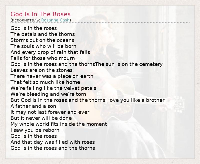 God is in the roses The petals and the thorns Storms out on the oceans The souls who will be born And every drop of rain that falls Falls for those who mourn God is in the roses and the thornsThe sun is on the cemetery Leaves are on the stones There never was a place on earth That felt so much like home We're falling like the velvet petals We're bleeding and we're torn But God is in the roses and the thornsI love you like a brother A father and a son It may not last forever and ever But it never will be done My whole world fits inside the moment I saw you be reborn God is in the roses And that day was filled with roses God is in the roses and the thorns