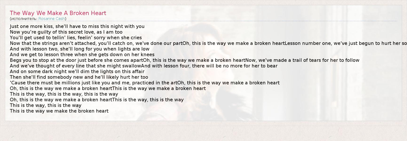 Just one more kiss, she'll have to miss this night with you Now you're guilty of this secret love, as I am too You'll get used to tellin' lies, feelin' sorry when she cries Now that the strings aren't attached, you'll catch on, we've done our partOh, this is the way we make a broken heartLesson number one, we've just begun to hurt her so And with lesson two, she'll long for you when lights are low And we get to lesson three when she gets down on her knees Begs you to stop at the door just before she comes apartOh, this is the way we make a broken heartNow, we've made a trail of tears for her to follow And we've thought of every line that she might swallowAnd with lesson four, there will be no more for her to bear And on some dark night we'll dim the lights on this affair Then she'll find somebody new and he'll likely hurt her too 'Cause there must be millions just like you and me, practiced in the artOh, this is the way we make a broken heart Oh, this is the way we make a broken heartThis is the way we make a broken heart This is the way, this is the way, this is the way Oh, this is the way we make a broken heartThis is the way, this is the way This is the way, this is the way This is the way we make the broken heart