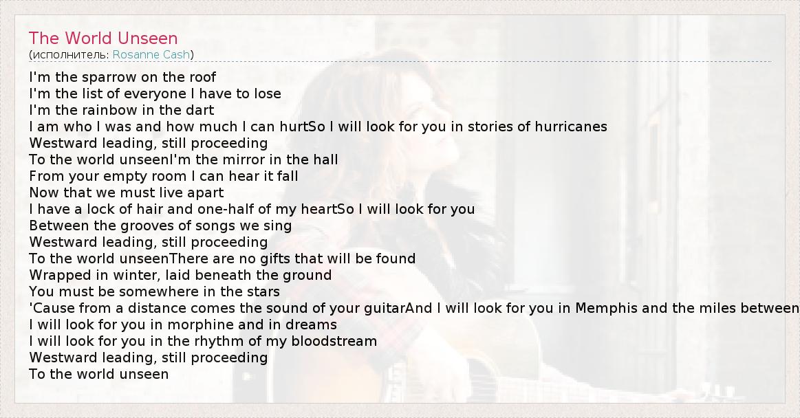 I'm the sparrow on the roof I'm the list of everyone I have to lose I'm the rainbow in the dart I am who I was and how much I can hurtSo I will look for you in stories of hurricanes Westward leading, still proceeding To the world unseenI'm the mirror in the hall From your empty room I can hear it fall Now that we must live apart I have a lock of hair and one-half of my heartSo I will look for you Between the grooves of songs we sing Westward leading, still proceeding To the world unseenThere are no gifts that will be found Wrapped in winter, laid beneath the ground You must be somewhere in the stars 'Cause from a distance comes the sound of your guitarAnd I will look for you in Memphis and the miles between I will look for you in morphine and in dreams I will look for you in the rhythm of my bloodstream Westward leading, still proceeding To the world unseen