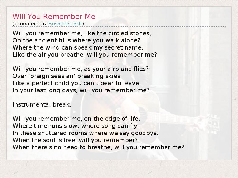 А как ты думаешь, о чем песня "Will You Remember Me" ?