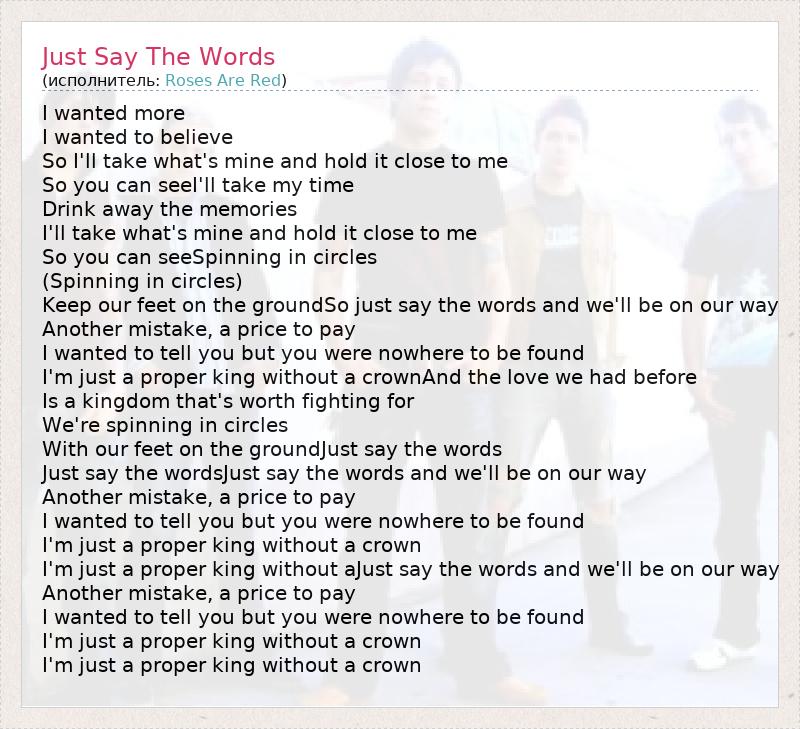 I wanted more I wanted to believe So I'll take what's mine and hold it close to me So you can seeI'll take my time Drink away the memories I'll take what's mine and hold it close to me So you can seeSpinning in circles (Spinning in circles) Keep our feet on the groundSo just say the words and we'll be on our way Another mistake, a price to pay I wanted to tell you but you were nowhere to be found I'm just a proper king without a crownAnd the love we had before Is a kingdom that's worth fighting for We're spinning in circles With our feet on the groundJust say the words Just say the wordsJust say the words and we'll be on our way Another mistake, a price to pay I wanted to tell you but you were nowhere to be found I'm just a proper king without a crown I'm just a proper king without aJust say the words and we'll be on our way Another mistake, a price to pay I wanted to tell you but you were nowhere to be found I'm just a proper king without a crown I'm just a proper king without a crown