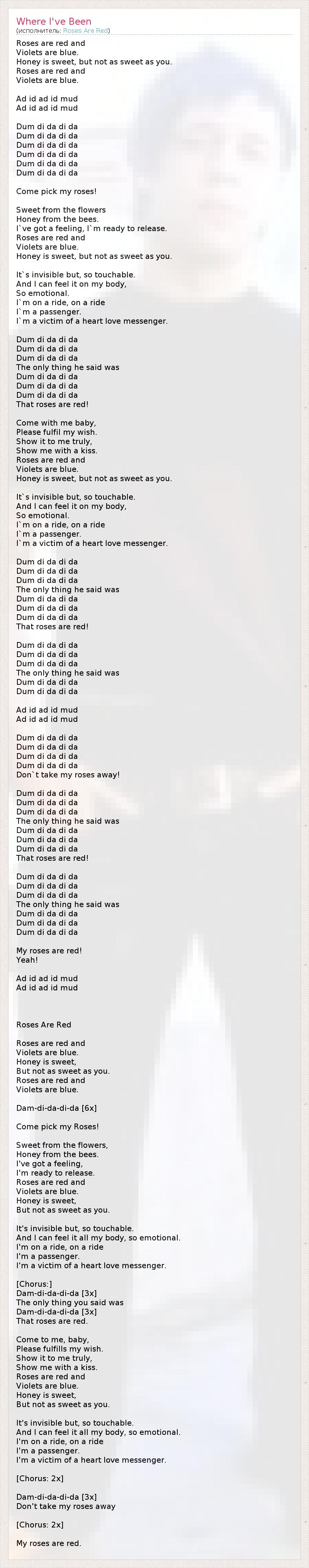 Roses are red and Violets are blue. Honey is sweet, but not as sweet as you. Roses are red and Violets are blue. Ad id ad id mud Ad id ad id mud Dum di da di da Dum di da di da Dum di da di da Dum di da di da Dum di da di da Dum di da di da Come pick my roses! Sweet from the flowers Honey from the bees. I`ve got a feeling, I`m ready to release. Roses are red and Violets are blue. Honey is sweet, but not as sweet as you. It`s invisible but, so touchable. And I can feel it on my body, So emotional. I`m on a ride, on a ride I`m a passenger. I`m a victim of a heart love messenger. Dum di da di da Dum di da di da Dum di da di da The only thing he said was Dum di da di da Dum di da di da Dum di da di da That roses are red! Come with me baby, Please fulfil my wish. Show it to me truly, Show me with a kiss. Roses are red and Violets are blue. Honey is sweet, but not as sweet as you. It`s invisible but, so touchable. And I can feel it on my body, So emotional. I`m on a ride, on a ride I`m a passenger. I`m a victim of a heart love messenger. Dum di da di da Dum di da di da Dum di da di da The only thing he said was Dum di da di da Dum di da di da Dum di da di da That roses are red! Dum di da di da Dum di da di da Dum di da di da The only thing he said was Dum di da di da Dum di da di da Ad id ad id mud Ad id ad id mud Dum di da di da Dum di da di da Dum di da di da Dum di da di da Don`t take my roses away! Dum di da di da Dum di da di da Dum di da di da The only thing he said was Dum di da di da Dum di da di da Dum di da di da That roses are red! Dum di da di da Dum di da di da Dum di da di da The only thing he said was Dum di da di da Dum di da di da Dum di da di da My roses are red! Yeah! Ad id ad id mud Ad id ad id mud Roses Are Red Roses are red and Violets are blue. Honey is sweet, But not as sweet as you. Roses are red and Violets are blue. Dam-di-da-di-da [6x] Come pick my Roses! Sweet from the flowers, Honey from the bees. I've got a feeling, I'm ready to release. Roses are red and Violets are blue. Honey is sweet, But not as sweet as you. It's invisible but, so touchable. And I can feel it all my body, so emotional. I'm on a ride, on a ride I'm a passenger. I'm a victim of a heart love messenger. [Chorus:] Dam-di-da-di-da [3x] The only thing you said was Dam-di-da-di-da [3x] That roses are red. Come to me, baby, Please fulfills my wish. Show it to me truly, Show me with a kiss. Roses are red and Violets are blue. Honey is sweet, But not as sweet as you. It's invisible but, so touchable. And I can feel it all my body, so emotional. I'm on a ride, on a ride I'm a passenger. I'm a victim of a heart love messenger. [Chorus: 2x] Dam-di-da-di-da [3x] Don't take my roses away [Chorus: 2x] My roses are red.