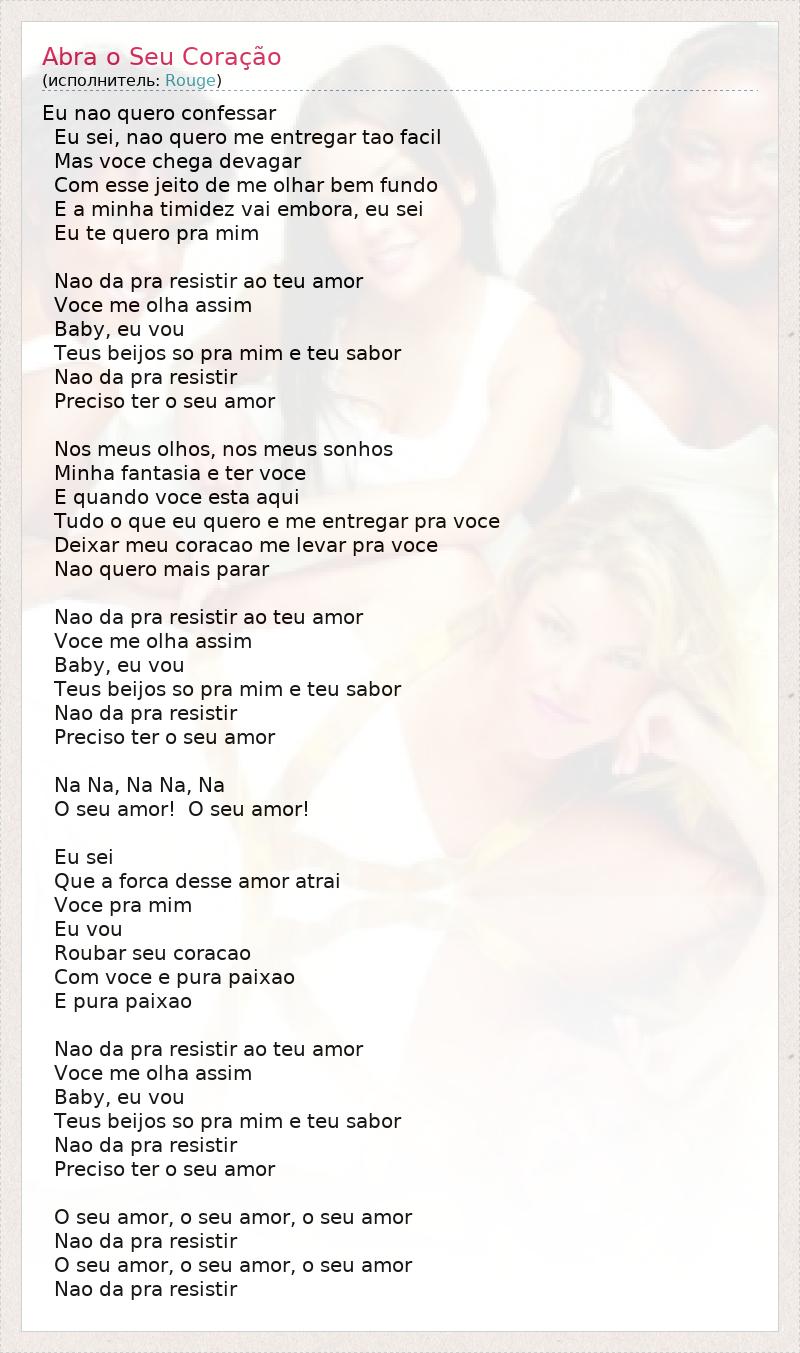 Eu nao quero confessar Eu sei, nao quero me entregar tao facil Mas voce chega devagar Com esse jeito de me olhar bem fundo E a minha timidez vai embora, eu sei Eu te quero pra mim Nao da pra resistir ao teu amor Voce me olha assim Baby, eu vou Teus beijos so pra mim e teu sabor Nao da pra resistir Preciso ter o seu amor Nos meus olhos, nos meus sonhos Minha fantasia e ter voce E quando voce esta aqui Tudo o que eu quero e me entregar pra voce Deixar meu coracao me levar pra voce Nao quero mais parar Nao da pra resistir ao teu amor Voce me olha assim Baby, eu vou Teus beijos so pra mim e teu sabor Nao da pra resistir Preciso ter o seu amor Na Na, Na Na, Na O seu amor! O seu amor! Eu sei Que a forca desse amor atrai Voce pra mim Eu vou Roubar seu coracao Com voce e pura paixao E pura paixao Nao da pra resistir ao teu amor Voce me olha assim Baby, eu vou Teus beijos so pra mim e teu sabor Nao da pra resistir Preciso ter o seu amor O seu amor, o seu amor, o seu amor Nao da pra resistir O seu amor, o seu amor, o seu amor Nao da pra resistir