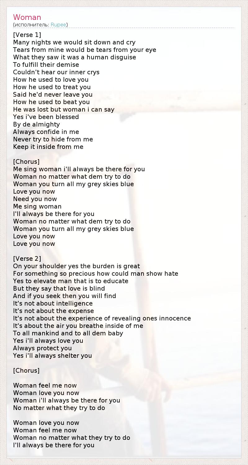 [Verse 1] Many nights we would sit down and cry Tears from mine would be tears from your eye What they saw it was a human disguise To fulfill their demise Couldn't hear our inner crys How he used to love you How he used to treat you Said he'd never leave you How he used to beat you He was lost but woman i can say Yes i've been blessed By de almighty Always confide in me Never try to hide from me Keep it inside from me [Chorus] Me sing woman i'll always be there for you Woman no matter what dem try to do Woman you turn all my grey skies blue Love you now Need you now Me sing woman I'll always be there for you Woman no matter what dem try to do Woman you turn all my grey skies blue Love you now Love you now [Verse 2] On your shoulder yes the burden is great For something so precious how could man show hate Yes to elevate man that is to educate But they say that love is blind And if you seek then you will find It's not about intelligence It's not about the expense It's not about the experience of revealing ones innocence It's about the air you breathe inside of me To all mankind and to all dem baby Yes i'll always love you Always protect you Yes i'll always shelter you [Chorus] Woman feel me now Woman love you now Woman i'll always be there for you No matter what they try to do Woman love you now Woman feel me now Woman no matter what they try to do I'll always be there for you