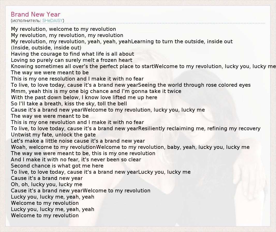 My revolution, welcome to my revolution My revolution, my revolution, my revolution My revolution, my revolution, yeah, yeah, yeahLearning to turn the outside, inside out (Inside, outside, inside out) Having the courage to find what life is all about Loving so purely can surely melt a frozen heart Knowing sometimes all over's the perfect place to startWelcome to my revolution, lucky you, lucky me The way we were meant to be This is my one resolution and I make it with no fear To live, to love today, cause it's a brand new yearSeeing the world through rose colored eyes Mmm, yeah this is my one big chance and I'm gonna take it twice With the past down below, I know love lifted me up here So I'll take a breath, kiss the sky, toll the bell Cause it's a brand new yearWelcome to my revolution, lucky you, lucky me The way we were meant to be This is my one revolution and I make it with no fear To live, to love today, cause it's a brand new yearResiliently reclaiming me, refining my recovery Untwist my fate, unlock the gate Let's make a little noise cause it's a brand new year Woah, welcome to my revolutionWelcome to my revolution, baby, yeah, lucky you, lucky me The way we were meant to be, this is my one revolution And I make it with no fear, it's never been so clear Second chance is what got me here To live, to love today, cause it's a brand new yearLucky you, lucky me Cause it's a brand new year Oh, oh, lucky you, lucky me Cause it's a brand new yearWelcome to my revolution Lucky you, lucky me, yeah, yeah Welcome to my revolution Lucky you, lucky me, yeah, yeah Welcome to my revolution