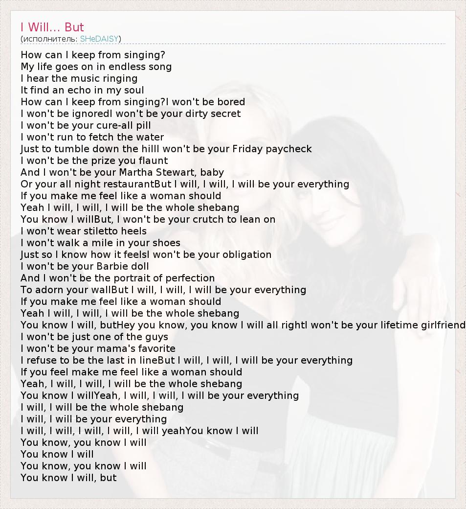 How can I keep from singing? My life goes on in endless song I hear the music ringing It find an echo in my soul How can I keep from singing?I won't be bored I won't be ignoredI won't be your dirty secret I won't be your cure-all pill I won't run to fetch the water Just to tumble down the hillI won't be your Friday paycheck I won't be the prize you flaunt And I won't be your Martha Stewart, baby Or your all night restaurantBut I will, I will, I will be your everything If you make me feel like a woman should Yeah I will, I will, I will be the whole shebang You know I willBut, I won't be your crutch to lean on I won't wear stiletto heels I won't walk a mile in your shoes Just so I know how it feelsI won't be your obligation I won't be your Barbie doll And I won't be the portrait of perfection To adorn your wallBut I will, I will, I will be your everything If you make me feel like a woman should Yeah I will, I will, I will be the whole shebang You know I will, butHey you know, you know I will all rightI won't be your lifetime girlfriend I won't be just one of the guys I won't be your mama's favorite I refuse to be the last in lineBut I will, I will, I will be your everything If you feel make me feel like a woman should Yeah, I will, I will, I will be the whole shebang You know I willYeah, I will, I will, I will be your everything I will, I will be the whole shebang I will, I will be your everything I will, I will, I will, I will, I will yeahYou know I will You know, you know I will You know I will You know, you know I will You know I will, but