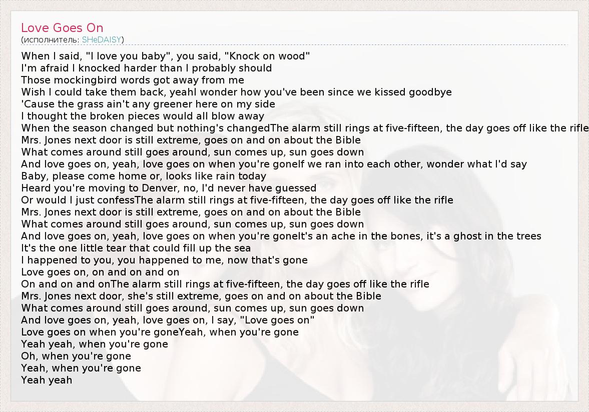 When I said, "I love you baby", you said, "Knock on wood" I'm afraid I knocked harder than I probably should Those mockingbird words got away from me Wish I could take them back, yeahI wonder how you've been since we kissed goodbye 'Cause the grass ain't any greener here on my side I thought the broken pieces would all blow away When the season changed but nothing's changedThe alarm still rings at five-fifteen, the day goes off like the rifle Mrs. Jones next door is still extreme, goes on and on about the Bible What comes around still goes around, sun comes up, sun goes down And love goes on, yeah, love goes on when you're goneIf we ran into each other, wonder what I'd say Baby, please come home or, looks like rain today Heard you're moving to Denver, no, I'd never have guessed Or would I just confessThe alarm still rings at five-fifteen, the day goes off like the rifle Mrs. Jones next door is still extreme, goes on and on about the Bible What comes around still goes around, sun comes up, sun goes down And love goes on, yeah, love goes on when you're goneIt's an ache in the bones, it's a ghost in the trees It's the one little tear that could fill up the sea I happened to you, you happened to me, now that's gone Love goes on, on and on and on On and on and onThe alarm still rings at five-fifteen, the day goes off like the rifle Mrs. Jones next door, she's still extreme, goes on and on about the Bible What comes around still goes around, sun comes up, sun goes down And love goes on, yeah, love goes on, I say, "Love goes on" Love goes on when you're goneYeah, when you're gone Yeah yeah, when you're gone Oh, when you're gone Yeah, when you're gone Yeah yeah