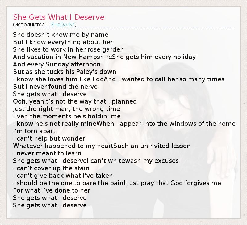 А как ты думаешь, о чем песня "She Gets What I Deserve" ?