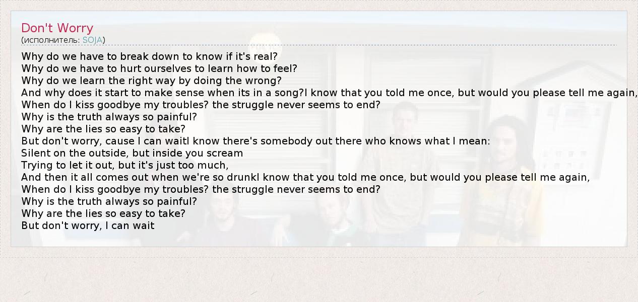 Это интересно:Soldiers of Jah Army (SOJA) — регги-коллектив, базирующейся в Арлингтоне, штат Виргиния в районе Вашингтона, округ Колумбия. Запуск в качестве активной группы в 1997 году, их музыка выпускается под лейблом Innerloop.Дискография * Soldiers of Jah Army (2000) * Peace in a Time of War (2003) * Dub in a Time of War (2005) * Get Wiser (2006) текст песен * Get Wiser Live DVD (2007) * Stars & Stripes EP (2008) * Born In Babylon (2009) * Strength... продолжение
