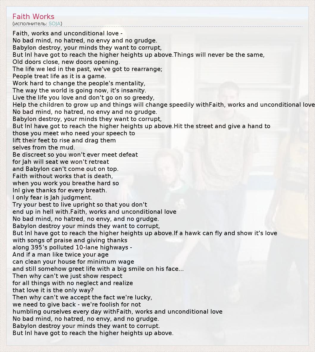 Faith, works and unconditional love - No bad mind, no hatred, no envy and no grudge. Babylon destroy, your minds they want to corrupt, But InI have got to reach the higher heights up above.Things will never be the same, Old doors close, new doors opening. The life we led in the past, we've got to rearrange; People treat life as it is a game. Work hard to change the people's mentality, The way the world is going now, it's insanity. Live the life you love and don't go on so greedy, Help the children to grow up and things will change speedily withFaith, works and unconditional love No bad mind, no hatred, no envy and no grudge. Babylon destroy, your minds they want to corrupt, But InI have got to reach the higher heights up above.Hit the street and give a hand to those you meet who need your speech to lift their feet to rise and drag them selves from the mud. Be discreet so you won't ever meet defeat for Jah will seat we won't retreat and Babylon can't come out on top. Faith without works that is death, when you work you breathe hard so InI give thanks for every breath. I only fear is Jah judgment. Try your best to live upright so that you don't end up in hell with.Faith, works and unconditional love No bad mind, no hatred, no envy, and no grudge. Babylon destroy your minds they want to corrupt, But InI have got to reach the higher heights up above.If a hawk can fly and show it's love with songs of praise and giving thanks along 395's polluted 10-lane highways - And if a man like twice your age can clean your house for minimum wage and still somehow greet life with a big smile on his face... Then why can't we just show respect for all things with no neglect and realize that love it is the only way? Then why can't we accept the fact we're lucky, we need to give back - we're foolish for not humbling ourselves every day withFaith, works and unconditional love No bad mind, no hatred, no envy, and no grudge. Babylon destroy your minds they want to corrupt. But InI have got to reach the higher heights up above.