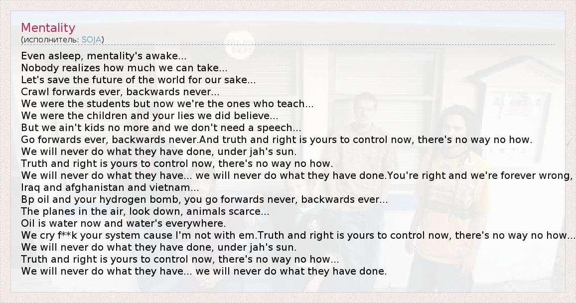 Это интересно:Soldiers of Jah Army (SOJA) — регги-коллектив, базирующейся в Арлингтоне, штат Виргиния в районе Вашингтона, округ Колумбия. Запуск в качестве активной группы в 1997 году, их музыка выпускается под лейблом Innerloop.Дискография * Soldiers of Jah Army (2000) * Peace in a Time of War (2003) * Dub in a Time of War (2005) * Get Wiser (2006) текст песен * Get Wiser Live DVD (2007) * Stars & Stripes EP (2008) * Born In Babylon (2009) * Strength... продолжение