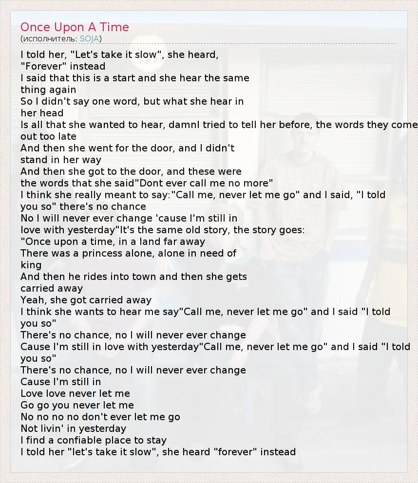 I told her, "Let's take it slow", she heard, "Forever" instead I said that this is a start and she hear the same thing again So I didn't say one word, but what she hear in her head Is all that she wanted to hear, damnI tried to tell her before, the words they come out too late And then she went for the door, and I didn't stand in her way And then she got to the door, and these were the words that she said"Dont ever call me no more" I think she really meant to say:"Call me, never let me go" and I said, "I told you so" there's no chance No I will never ever change 'cause I'm still in love with yesterday"It's the same old story, the story goes: "Once upon a time, in a land far away There was a princess alone, alone in need of king And then he rides into town and then she gets carried away Yeah, she got carried away I think she wants to hear me say"Call me, never let me go" and I said "I told you so" There's no chance, no I will never ever change Cause I'm still in love with yesterday"Call me, never let me go" and I said "I told you so" There's no chance, no I will never ever change Cause I'm still in Love love never let me Go go you never let me No no no no don't ever let me go Not livin' in yesterday I find a confiable place to stay I told her "let's take it slow", she heard "forever" instead