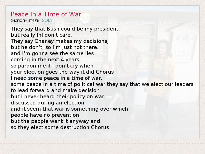 They say that Bush could be my president, but really InI don't care. They say Cheney makes my decisions, but he don't, so I'm just not there. and I'm gonna see the same lies coming in the next 4 years, so pardon me if I don't cry when your election goes the way it did.Chorus I need some peace in a time of war, some peace in a time of political war.they say that we elect our leaders to lead forward and make decision. but i never heard their policy on war discussed during an election. and it seem that war is something over which people have no prevention. but the people want it anyway and so they elect some destruction.Chorus