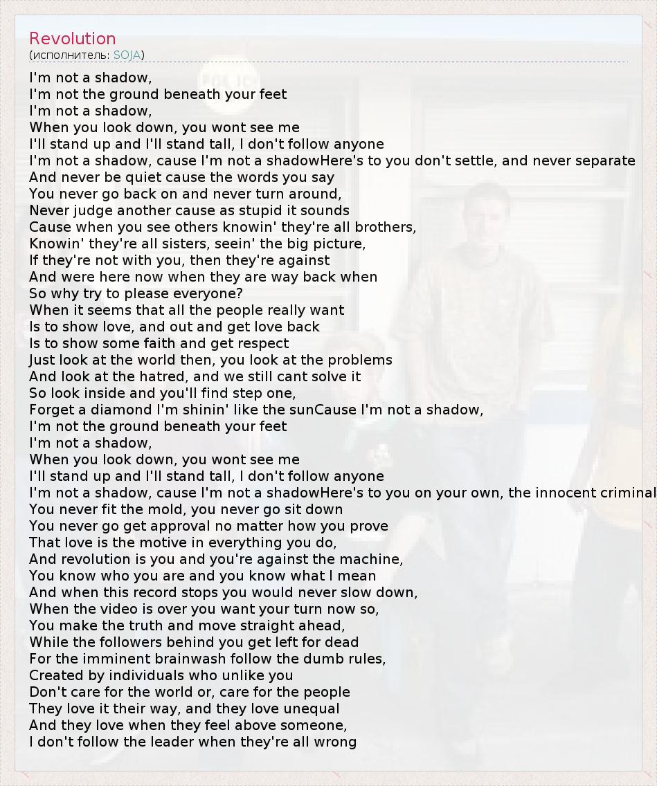 I'm not a shadow, I'm not the ground beneath your feet I'm not a shadow, When you look down, you wont see me I'll stand up and I'll stand tall, I don't follow anyone I'm not a shadow, cause I'm not a shadowHere's to you don't settle, and never separate And never be quiet cause the words you say You never go back on and never turn around, Never judge another cause as stupid it sounds Cause when you see others knowin' they're all brothers, Knowin' they're all sisters, seein' the big picture, If they're not with you, then they're against And were here now when they are way back when So why try to please everyone? When it seems that all the people really want Is to show love, and out and get love back Is to show some faith and get respect Just look at the world then, you look at the problems And look at the hatred, and we still cant solve it So look inside and you'll find step one, Forget a diamond I'm shinin' like the sunCause I'm not a shadow, I'm not the ground beneath your feet I'm not a shadow, When you look down, you wont see me I'll stand up and I'll stand tall, I don't follow anyone I'm not a shadow, cause I'm not a shadowHere's to you on your own, the innocent criminal You never fit the mold, you never go sit down You never go get approval no matter how you prove That love is the motive in everything you do, And revolution is you and you're against the machine, You know who you are and you know what I mean And when this record stops you would never slow down, When the video is over you want your turn now so, You make the truth and move straight ahead, While the followers behind you get left for dead For the imminent brainwash follow the dumb rules, Created by individuals who unlike you Don't care for the world or, care for the people They love it their way, and they love unequal And they love when they feel above someone, I don't follow the leader when they're all wrong