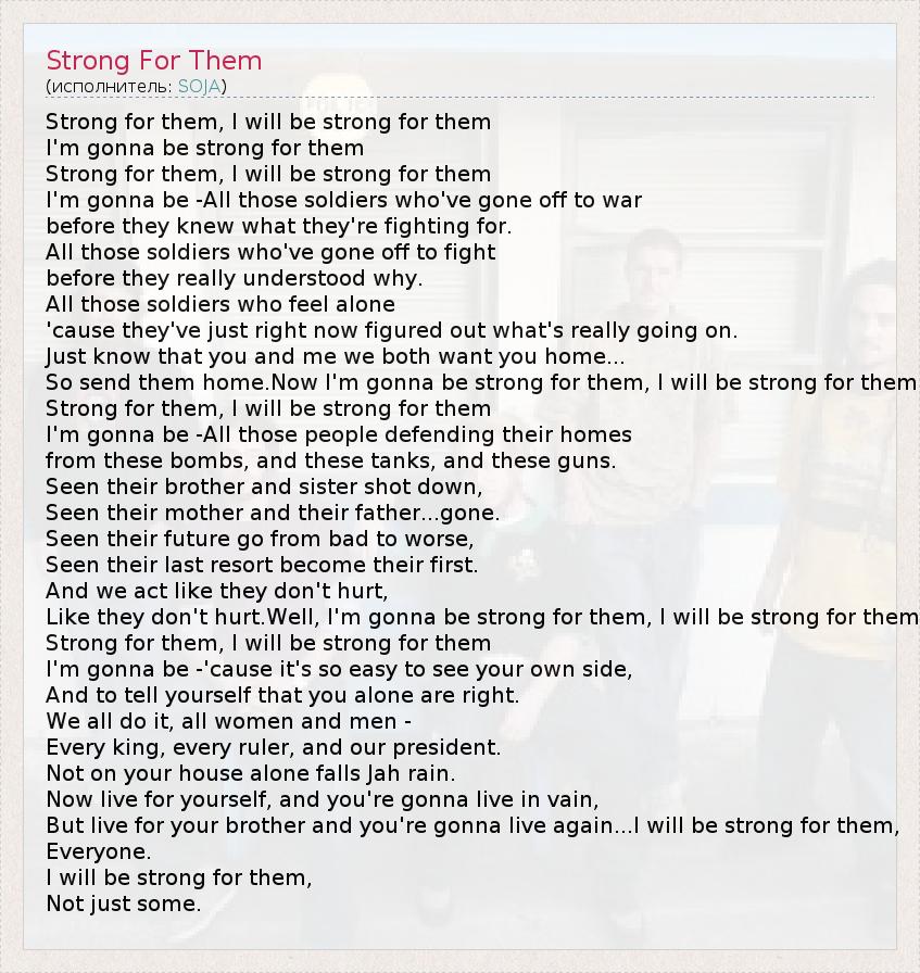 Strong for them, I will be strong for them I'm gonna be strong for them Strong for them, I will be strong for them I'm gonna be -All those soldiers who've gone off to war before they knew what they're fighting for. All those soldiers who've gone off to fight before they really understood why. All those soldiers who feel alone 'cause they've just right now figured out what's really going on. Just know that you and me we both want you home... So send them home.Now I'm gonna be strong for them, I will be strong for them Strong for them, I will be strong for them I'm gonna be -All those people defending their homes from these bombs, and these tanks, and these guns. Seen their brother and sister shot down, Seen their mother and their father...gone. Seen their future go from bad to worse, Seen their last resort become their first. And we act like they don't hurt, Like they don't hurt.Well, I'm gonna be strong for them, I will be strong for them Strong for them, I will be strong for them I'm gonna be -'cause it's so easy to see your own side, And to tell yourself that you alone are right. We all do it, all women and men - Every king, every ruler, and our president. Not on your house alone falls Jah rain. Now live for yourself, and you're gonna live in vain, But live for your brother and you're gonna live again...I will be strong for them, Everyone. I will be strong for them, Not just some.