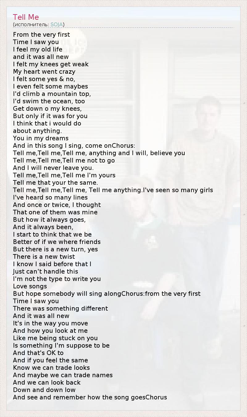 From the very first Time I saw you I feel my old life and it was all new I felt my knees get weak My heart went crazy I felt some yes & no, I even felt some maybes I'd climb a mountain top, I'd swim the ocean, too Get down o my knees, But only if it was for you I think that i would do about anything. You in my dreams And in this song I sing, come onChorus: Tell me,Tell me,Tell me, anything and I will, believe you Tell me,Tell me,Tell me not to go And I will never leave you. Tell me,Tell me,Tell me I'm yours Tell me that your the same. Tell me,Tell me,Tell me, Tell me anything.I've seen so many girls I've heard so many lines And once or twice, I thought That one of them was mine But how it always goes, And it always been, I start to think that we be Better of if we where friends But there is a new turn, yes There is a new twist I know I said before that I Just can't handle this I'm not the type to write you Love songs But hope somebody will sing alongChorus:from the very first Time I saw you There was something different And it was all new It's in the way you move And how you look at me Like me being stuck on you Is something I'm suppose to be And that's OK to And if you feel the same Know we can trade looks And maybe we can trade names And we can look back Down and down low And see and remember how the song goesChorus