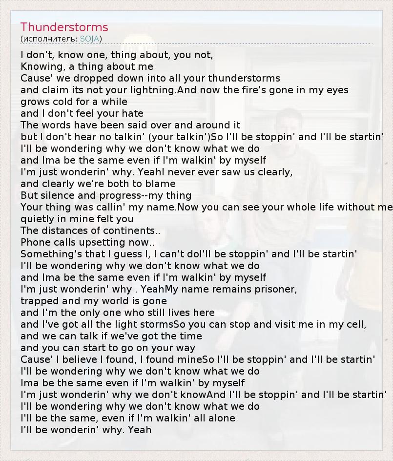 I don't, know one, thing about, you not, Knowing, a thing about me Cause' we dropped down into all your thunderstorms and claim its not your lightning.And now the fire's gone in my eyes grows cold for a while and I don't feel your hate The words have been said over and around it but I don't hear no talkin' (your talkin')So I'll be stoppin' and I'll be startin' I'll be wondering why we don't know what we do and Ima be the same even if I'm walkin' by myself I'm just wonderin' why. YeahI never ever saw us clearly, and clearly we're both to blame But silence and progress--my thing Your thing was callin' my name.Now you can see your whole life without me quietly in mine felt you The distances of continents.. Phone calls upsetting now.. Something's that I guess I, I can't doI'll be stoppin' and I'll be startin' I'll be wondering why we don't know what we do and Ima be the same even if I'm walkin' by myself I'm just wonderin' why . YeahMy name remains prisoner, trapped and my world is gone and I'm the only one who still lives here and I've got all the light stormsSo you can stop and visit me in my cell, and we can talk if we've got the time and you can start to go on your way Cause' I believe I found, I found mineSo I'll be stoppin' and I'll be startin' I'll be wondering why we don't know what we do Ima be the same even if I'm walkin' by myself I'm just wonderin' why we don't knowAnd I'll be stoppin' and I'll be startin' I'll be wondering why we don't know what we do I'll be the same, even if I'm walkin' all alone I'll be wonderin' why. Yeah
