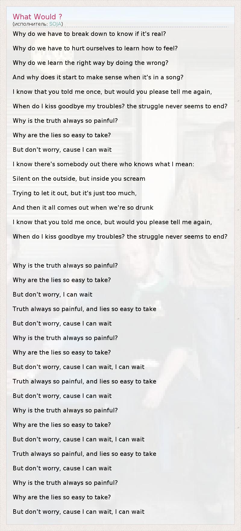 Why do we have to break down to know if it's real? Why do we have to hurt ourselves to learn how to feel? Why do we learn the right way by doing the wrong? And why does it start to make sense when it's in a song? I know that you told me once, but would you please tell me again, When do I kiss goodbye my troubles? the struggle never seems to end? Why is the truth always so painful? Why are the lies so easy to take? But don't worry, cause I can wait I know there's somebody out there who knows what I mean: Silent on the outside, but inside you scream Trying to let it out, but it's just too much, And then it all comes out when we're so drunk I know that you told me once, but would you please tell me again, When do I kiss goodbye my troubles? the struggle never seems to end? Why is the truth always so painful? Why are the lies so easy to take? But don't worry, I can wait Truth always so painful, and lies so easy to take But don't worry, cause I can wait Why is the truth always so painful? Why are the lies so easy to take? But don't worry, cause I can wait, I can wait Truth always so painful, and lies so easy to take But don't worry, cause I can wait Why is the truth always so painful? Why are the lies so easy to take? But don't worry, cause I can wait, I can wait Truth always so painful, and lies so easy to take But don't worry, cause I can wait Why is the truth always so painful? Why are the lies so easy to take? But don't worry, cause I can wait, I can wait