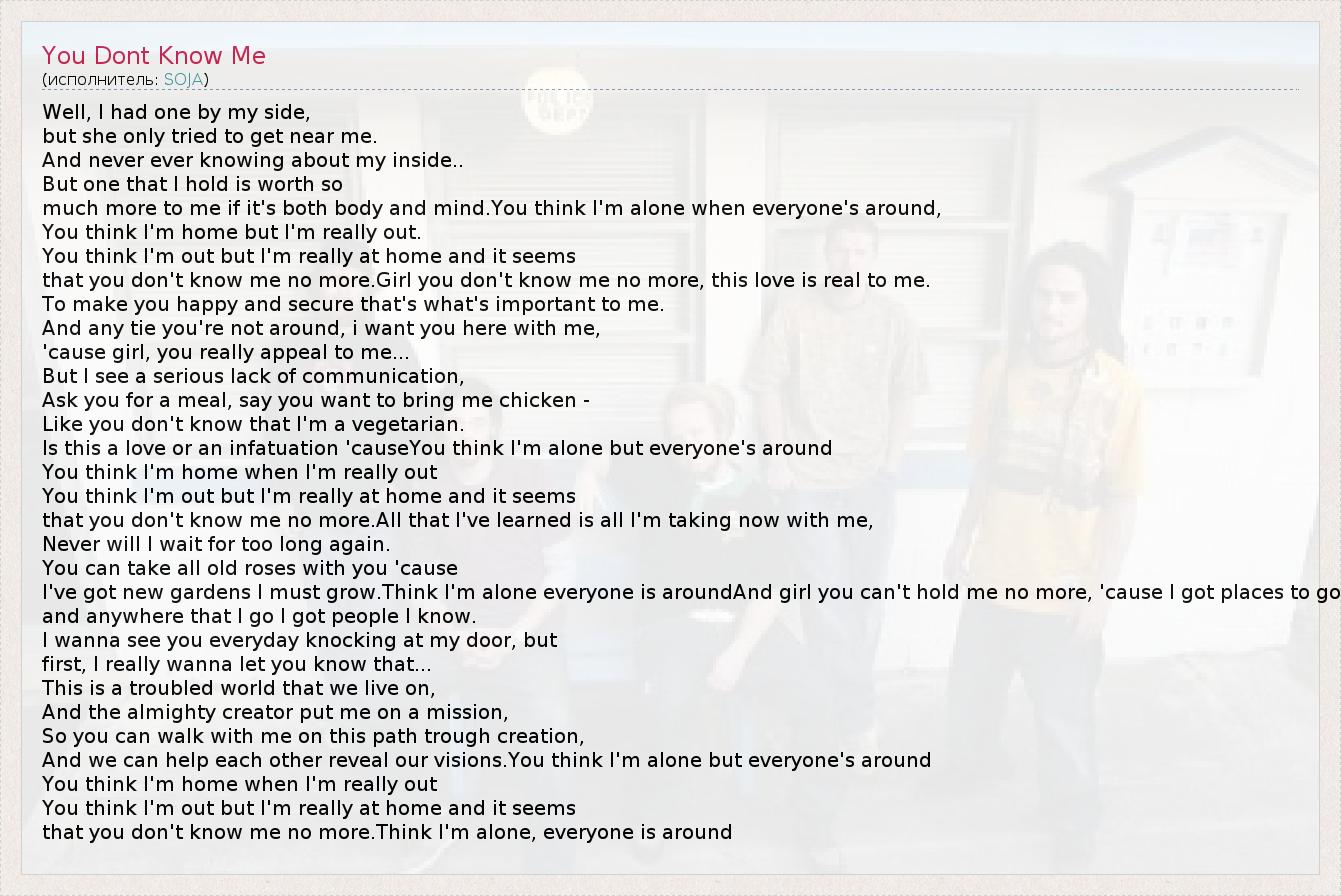 Well, I had one by my side, but she only tried to get near me. And never ever knowing about my inside.. But one that I hold is worth so much more to me if it's both body and mind.You think I'm alone when everyone's around, You think I'm home but I'm really out. You think I'm out but I'm really at home and it seems that you don't know me no more.Girl you don't know me no more, this love is real to me. To make you happy and secure that's what's important to me. And any tie you're not around, i want you here with me, 'cause girl, you really appeal to me... But I see a serious lack of communication, Ask you for a meal, say you want to bring me chicken - Like you don't know that I'm a vegetarian. Is this a love or an infatuation 'causeYou think I'm alone but everyone's around You think I'm home when I'm really out You think I'm out but I'm really at home and it seems that you don't know me no more.All that I've learned is all I'm taking now with me, Never will I wait for too long again. You can take all old roses with you 'cause I've got new gardens I must grow.Think I'm alone everyone is aroundAnd girl you can't hold me no more, 'cause I got places to go and anywhere that I go I got people I know. I wanna see you everyday knocking at my door, but first, I really wanna let you know that... This is a troubled world that we live on, And the almighty creator put me on a mission, So you can walk with me on this path trough creation, And we can help each other reveal our visions.You think I'm alone but everyone's around You think I'm home when I'm really out You think I'm out but I'm really at home and it seems that you don't know me no more.Think I'm alone, everyone is around