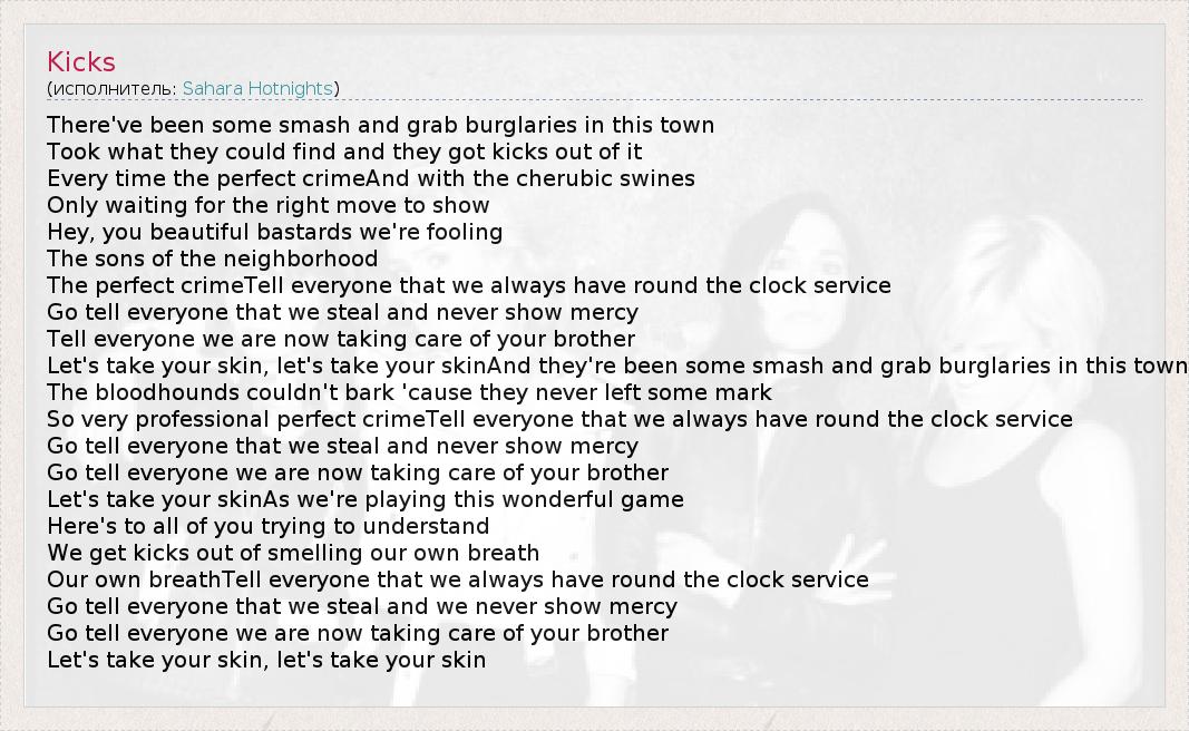 There've been some smash and grab burglaries in this town Took what they could find and they got kicks out of it Every time the perfect crimeAnd with the cherubic swines Only waiting for the right move to show Hey, you beautiful bastards we're fooling The sons of the neighborhood The perfect crimeTell everyone that we always have round the clock service Go tell everyone that we steal and never show mercy Tell everyone we are now taking care of your brother Let's take your skin, let's take your skinAnd they're been some smash and grab burglaries in this town The bloodhounds couldn't bark 'cause they never left some mark So very professional perfect crimeTell everyone that we always have round the clock service Go tell everyone that we steal and never show mercy Go tell everyone we are now taking care of your brother Let's take your skinAs we're playing this wonderful game Here's to all of you trying to understand We get kicks out of smelling our own breath Our own breathTell everyone that we always have round the clock service Go tell everyone that we steal and we never show mercy Go tell everyone we are now taking care of your brother Let's take your skin, let's take your skin