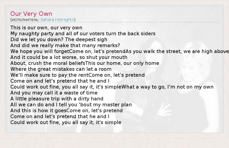 This is our own, our very own My naughty party and all of our voters turn the back siders Did we let you down? The deepest sigh And did we really make that many remarks? We hope you will forgetCome on, let's pretendAs you walk the street, we are high above And it could be a lot worse, so shut your mouth About, crush the moral beliefsThis our home, our only home Where the great mistakes can let a room We'll make sure to pay the rentCome on, let's pretend Come on and let's pretend that he and I Could work out fine, you all say it, it's simpleWhat a way to go, I'm not on my own And you may call it a waste of time A little pleasure trip with a dirty hand All we can do and I tell you 'bout my master plan And this is how it goesCome on, let's pretend Come on and let's pretend that he and I Could work out fine, you all say it, it's simple