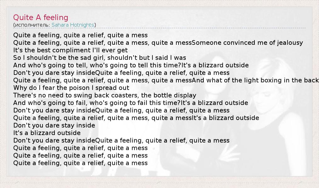 А как ты думаешь, о чем песня "Quite A feeling" ?