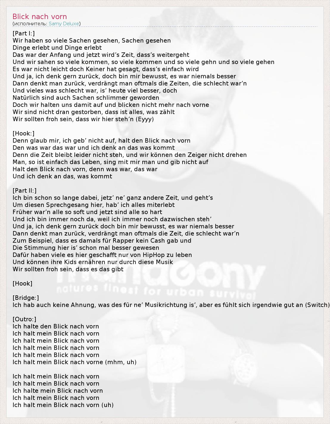 [Part I:] Wir haben so viele Sachen gesehen, Sachen gesehen Dinge erlebt und Dinge erlebt Das war der Anfang und jetzt wird’s Zeit, dass’s weitergeht Und wir sahen so viele kommen, so viele kommen und so viele gehn und so viele gehen Es war nicht leicht doch Keiner hat gesagt, dass’s einfach wird Und ja, ich denk gern zurück, doch bin mir bewusst, es war niemals besser Dann denkt man zurück, verdrängt man oftmals die Zeiten, die schlecht war’n Und vieles was schlecht war, is’ heute viel besser, doch Natürlich sind auch Sachen schlimmer geworden Doch wir halten uns damit auf und blicken nicht mehr nach vorne Wir sind nicht dran gestorben, dass ist alles, was zählt Wir sollten froh sein, dass wir hier steh’n (Eyyy) [Hook:] Denn glaub mir, ich geb’ nicht auf, halt den Blick nach vorn Den was war das war und ich denk an das was kommt Denn die Zeit bleibt leider nicht steh, und wir können den Zeiger nicht drehen Man, so ist einfach das Leben, sing mit mir man und gib nicht auf Halt den Blick nach vorn, denn was war, das war Und ich denk an das, was kommt [Part II:] Ich bin schon so lange dabei, jetz’ ne’ ganz andere Zeit, und geht’s Um diesen Sprechgesang hier, hab’ ich alles miterlebt Früher war’n alle so soft und jetzt sind alle so hart Und ich bin immer noch da, weil ich immer noch dazwischen steh’ Und ja, ich denk gern zurück doch bin mir bewusst, es war niemals besser Dann denkt man zurück, verdrängt man oftmals die Zeit, die schlecht war’n Zum Beispiel, dass es damals für Rapper kein Cash gab und Die Stimmung hier is’ schon mal besser gewesen Dafür haben viele es hier geschafft nur von HipHop zu leben Und können ihre Kids ernähren nur durch diese Musik Wir sollten froh sein, dass es das gibt [Hook] [Bridge:] Ich hab auch keine Ahnung, was des für ne’ Musikrichtung is’, aber es fühlt sich irgendwie gut an (Switch) [Outro:] Ich halte den Blick nach vorn Ich halt mein Blick nach vorn Ich halt mein Blick nach vorn Ich halt mein Blick nach vorn Ich halt mein Blick nach vorn Ich halt mein Blick nach vorne (mhm, uh) Ich halt mein Blick nach vorn Ich halt mein Blick nach vorn Ich halte mein Blick nach vorn Ich halt mein Blick nach vorn Ich halt mein Blick nach vorn (uh)