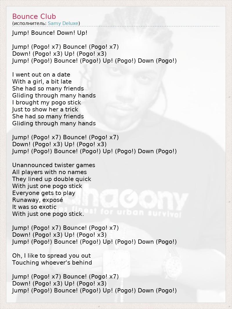Прыжок! Отскок! Вниз! Вверх! Прыжок! (Пого! x7) Отскок! (Пого! x7) Вниз! (Пого! x3) Вверх! (Пого! x3) Прыжок! (Пого!) Отскок! (Пого!) Вверх! (Пого!) Вниз! (Пого!) Я вышел на свидание C девушкой c небольшим опозданием. У неё было так много друзей (Она прошла через много рук) Я принёс свою пого-стик*, Просто чтобы показать ей трюк. У неё было так много друзей (Она прошла через много рук) Прыжок! (Пого! x7) Отскок! (Пого! x7) Вниз! (Пого! x3) Вверх! (Пого! x3) Прыжок! (Пого!) Отскок! (Пого!) Вверх! (Пого!) Вниз! (Пого!) Никем не объявленная игра в твистер**: Все безымянные игроки С двойной скоростью выстроились в очередь С одной только пого-стик. Все начали играть, Теряя самоконтроль, выставляясь напоказ. Это было так экзотично! С одной только пого-стик... Прыжок! (Пого! x7) Отскок! (Пого! x7) Вниз! (Пого! x3) Вверх! (Пого! x3) Прыжок! (Пого!) Отскок! (Пого!) Вверх! (Пого!) Вниз! (Пого!) О, как я люблю раздвигать тебе ноги, Касаясь того, кто сзади... Прыжок! (Пого! x7) Отскок! (Пого! x7) Вниз! (Пого! x3) Вверх! (Пого! x3) Прыжок! (Пого!) Отскок! (Пого!) Вверх! (Пого!) Вниз! (Пого!) *Пого-стик - устройство, состоящее из пружины, ручки, педалей и основной платформы. Соответственно смысл этого агрегата состоит в прыжке. Человек надавливает ногами на пружину и она отталкивает его вверх ** - подвижная игра на мате с цветными кругами.