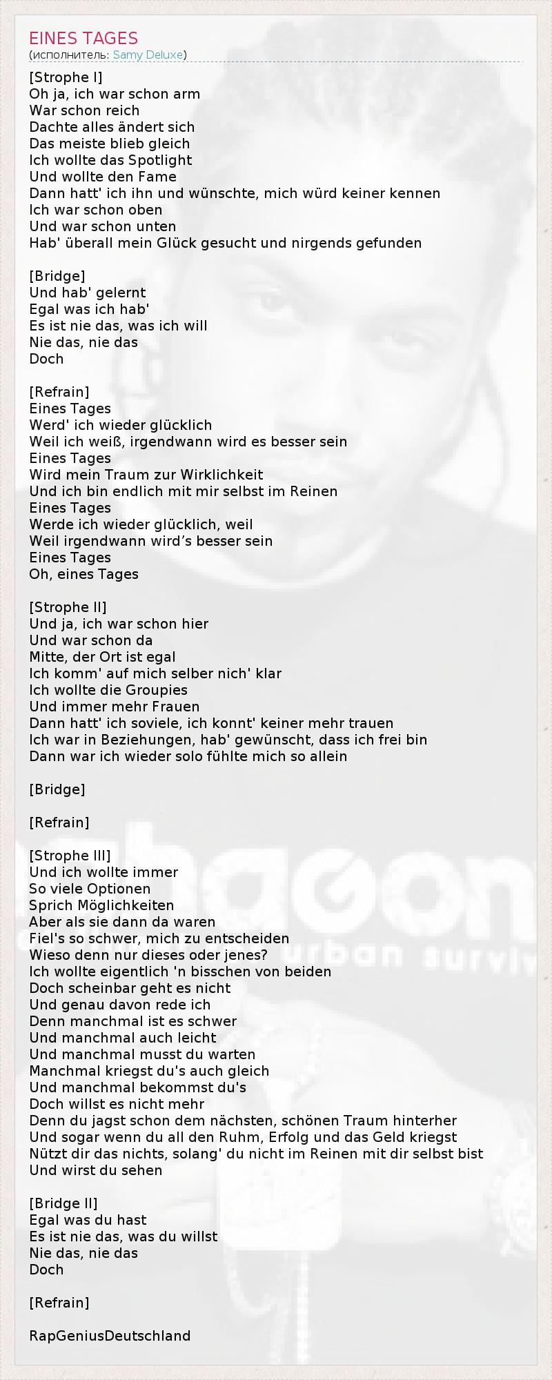 [Strophe I] Oh ja, ich war schon arm War schon reich Dachte alles ändert sich Das meiste blieb gleich Ich wollte das Spotlight Und wollte den Fame Dann hatt' ich ihn und wünschte, mich würd keiner kennen Ich war schon oben Und war schon unten Hab' überall mein Glück gesucht und nirgends gefunden [Bridge] Und hab' gelernt Egal was ich hab' Es ist nie das, was ich will Nie das, nie das Doch [Refrain] Eines Tages Werd' ich wieder glücklich Weil ich weiß, irgendwann wird es besser sein Eines Tages Wird mein Traum zur Wirklichkeit Und ich bin endlich mit mir selbst im Reinen Eines Tages Werde ich wieder glücklich, weil Weil irgendwann wird’s besser sein Eines Tages Oh, eines Tages [Strophe II] Und ja, ich war schon hier Und war schon da Mitte, der Ort ist egal Ich komm' auf mich selber nich' klar Ich wollte die Groupies Und immer mehr Frauen Dann hatt' ich soviele, ich konnt' keiner mehr trauen Ich war in Beziehungen, hab' gewünscht, dass ich frei bin Dann war ich wieder solo fühlte mich so allein [Bridge] [Refrain] [Strophe III] Und ich wollte immer So viele Optionen Sprich Möglichkeiten Aber als sie dann da waren Fiel's so schwer, mich zu entscheiden Wieso denn nur dieses oder jenes? Ich wollte eigentlich 'n bisschen von beiden Doch scheinbar geht es nicht Und genau davon rede ich Denn manchmal ist es schwer Und manchmal auch leicht Und manchmal musst du warten Manchmal kriegst du's auch gleich Und manchmal bekommst du's Doch willst es nicht mehr Denn du jagst schon dem nächsten, schönen Traum hinterher Und sogar wenn du all den Ruhm, Erfolg und das Geld kriegst Nützt dir das nichts, solang' du nicht im Reinen mit dir selbst bist Und wirst du sehen [Bridge II] Egal was du hast Es ist nie das, was du willst Nie das, nie das Doch [Refrain] RapGeniusDeutschland