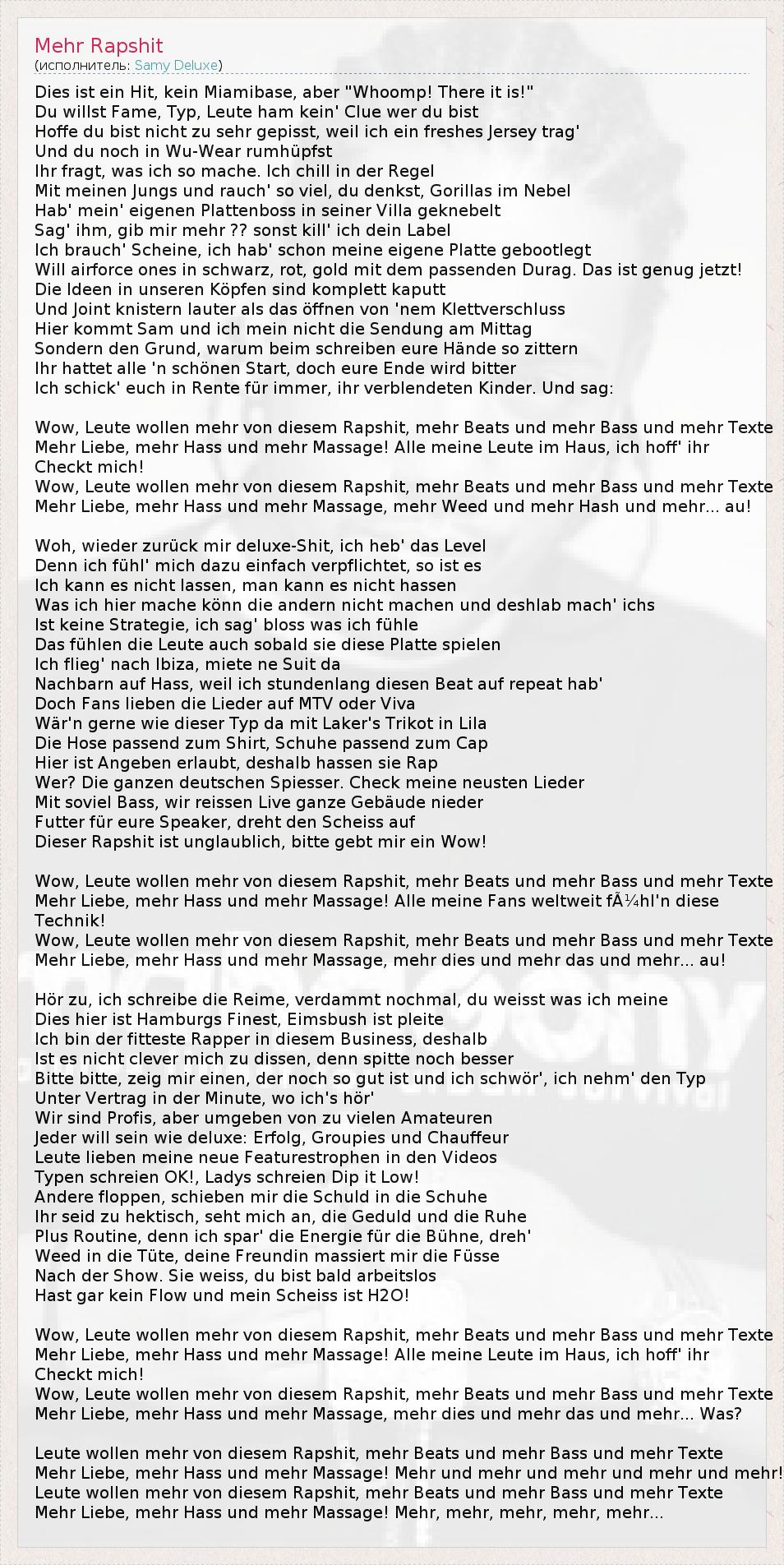Dies ist ein Hit, kein Miamibase, aber "Whoomp! There it is!" Du willst Fame, Typ, Leute ham kein' Clue wer du bist Hoffe du bist nicht zu sehr gepisst, weil ich ein freshes Jersey trag' Und du noch in Wu-Wear rumhüpfst Ihr fragt, was ich so mache. Ich chill in der Regel Mit meinen Jungs und rauch' so viel, du denkst, Gorillas im Nebel Hab' mein' eigenen Plattenboss in seiner Villa geknebelt Sag' ihm, gib mir mehr ?? sonst kill' ich dein Label Ich brauch' Scheine, ich hab' schon meine eigene Platte gebootlegt Will airforce ones in schwarz, rot, gold mit dem passenden Durag. Das ist genug jetzt! Die Ideen in unseren Köpfen sind komplett kaputt Und Joint knistern lauter als das öffnen von 'nem Klettverschluss Hier kommt Sam und ich mein nicht die Sendung am Mittag Sondern den Grund, warum beim schreiben eure Hände so zittern Ihr hattet alle 'n schönen Start, doch eure Ende wird bitter Ich schick' euch in Rente für immer, ihr verblendeten Kinder. Und sag: Wow, Leute wollen mehr von diesem Rapshit, mehr Beats und mehr Bass und mehr Texte Mehr Liebe, mehr Hass und mehr Massage! Alle meine Leute im Haus, ich hoff' ihr Checkt mich! Wow, Leute wollen mehr von diesem Rapshit, mehr Beats und mehr Bass und mehr Texte Mehr Liebe, mehr Hass und mehr Massage, mehr Weed und mehr Hash und mehr... au! Woh, wieder zurück mir deluxe-Shit, ich heb' das Level Denn ich fühl' mich dazu einfach verpflichtet, so ist es Ich kann es nicht lassen, man kann es nicht hassen Was ich hier mache könn die andern nicht machen und deshlab mach' ichs Ist keine Strategie, ich sag' bloss was ich fühle Das fühlen die Leute auch sobald sie diese Platte spielen Ich flieg' nach Ibiza, miete ne Suit da Nachbarn auf Hass, weil ich stundenlang diesen Beat auf repeat hab' Doch Fans lieben die Lieder auf MTV oder Viva Wär'n gerne wie dieser Typ da mit Laker's Trikot in Lila Die Hose passend zum Shirt, Schuhe passend zum Cap Hier ist Angeben erlaubt, deshalb hassen sie Rap Wer? Die ganzen deutschen Spiesser. Check meine neusten Lieder Mit soviel Bass, wir reissen Live ganze Gebäude nieder Futter für eure Speaker, dreht den Scheiss auf Dieser Rapshit ist unglaublich, bitte gebt mir ein Wow! Wow, Leute wollen mehr von diesem Rapshit, mehr Beats und mehr Bass und mehr Texte Mehr Liebe, mehr Hass und mehr Massage! Alle meine Fans weltweit fühl'n diese Technik! Wow, Leute wollen mehr von diesem Rapshit, mehr Beats und mehr Bass und mehr Texte Mehr Liebe, mehr Hass und mehr Massage, mehr dies und mehr das und mehr... au! Hör zu, ich schreibe die Reime, verdammt nochmal, du weisst was ich meine Dies hier ist Hamburgs Finest, Eimsbush ist pleite Ich bin der fitteste Rapper in diesem Business, deshalb Ist es nicht clever mich zu dissen, denn spitte noch besser Bitte bitte, zeig mir einen, der noch so gut ist und ich schwör', ich nehm' den Typ Unter Vertrag in der Minute, wo ich's hör' Wir sind Profis, aber umgeben von zu vielen Amateuren Jeder will sein wie deluxe: Erfolg, Groupies und Chauffeur Leute lieben meine neue Featurestrophen in den Videos Typen schreien OK!, Ladys schreien Dip it Low! Andere floppen, schieben mir die Schuld in die Schuhe Ihr seid zu hektisch, seht mich an, die Geduld und die Ruhe Plus Routine, denn ich spar' die Energie für die Bühne, dreh' Weed in die Tüte, deine Freundin massiert mir die Füsse Nach der Show. Sie weiss, du bist bald arbeitslos Hast gar kein Flow und mein Scheiss ist H2O! Wow, Leute wollen mehr von diesem Rapshit, mehr Beats und mehr Bass und mehr Texte Mehr Liebe, mehr Hass und mehr Massage! Alle meine Leute im Haus, ich hoff' ihr Checkt mich! Wow, Leute wollen mehr von diesem Rapshit, mehr Beats und mehr Bass und mehr Texte Mehr Liebe, mehr Hass und mehr Massage, mehr dies und mehr das und mehr... Was? Leute wollen mehr von diesem Rapshit, mehr Beats und mehr Bass und mehr Texte Mehr Liebe, mehr Hass und mehr Massage! Mehr und mehr und mehr und mehr und mehr! Leute wollen mehr von diesem Rapshit, mehr Beats und mehr Bass und mehr Texte Mehr Liebe, mehr Hass und mehr Massage! Mehr, mehr, mehr, mehr, mehr...