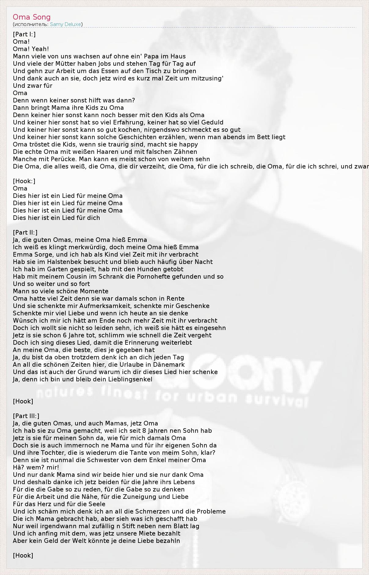 Это интересно:В 1997 году в Гамбурге, ФРГ, с выходом первой демо кассеты из серии Eimsbush Tapes начинается история одного из ярчайших немецкоговорящих МС Samy Deluxe. Эта кассета, разошедшаяся тиражом 10 тысяч экземпляров, содержала 8 песен группы Dynamite Deluxe, состоявшей из МС Сэмми Делюкса, диджея DJ Dynamite и битмейкера Tropf. Во многом эта кассета была большим прорывом в немецком хип-хопе и одновременно послужила началом... продолжение