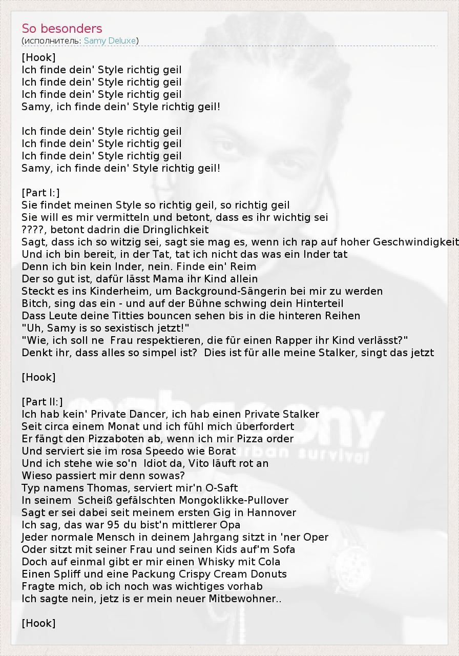 Это интересно:В 1997 году в Гамбурге, ФРГ, с выходом первой демо кассеты из серии Eimsbush Tapes начинается история одного из ярчайших немецкоговорящих МС Samy Deluxe. Эта кассета, разошедшаяся тиражом 10 тысяч экземпляров, содержала 8 песен группы Dynamite Deluxe, состоявшей из МС Сэмми Делюкса, диджея DJ Dynamite и битмейкера Tropf. Во многом эта кассета была большим прорывом в немецком хип-хопе и одновременно послужила началом... продолжение