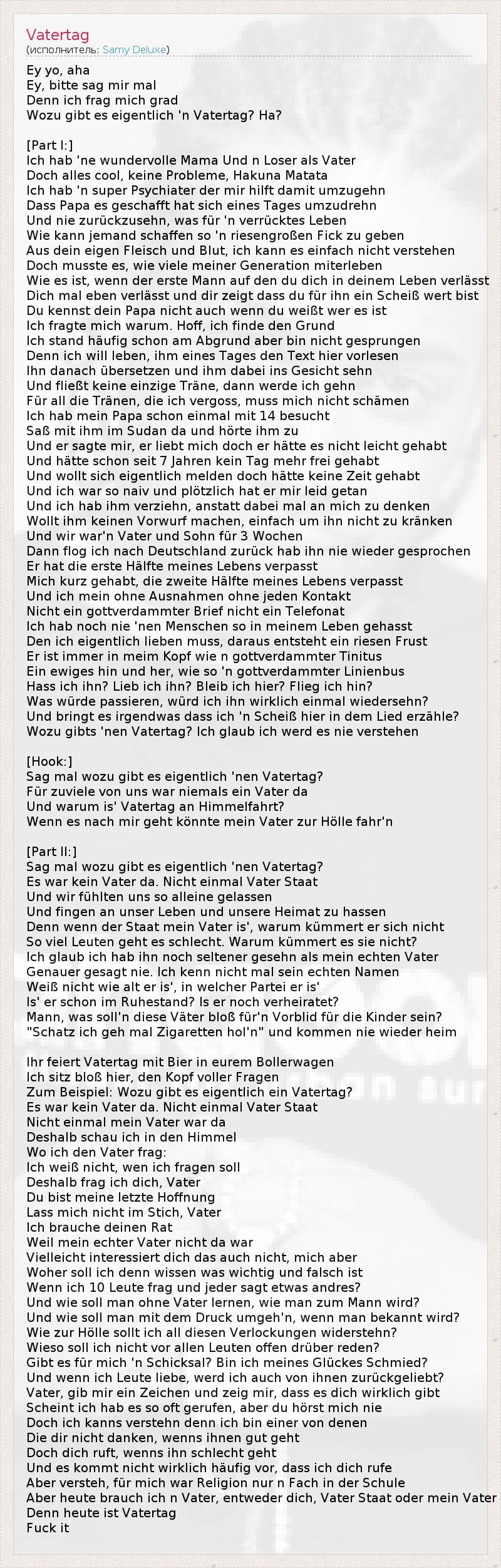 Ey yo, aha Ey, bitte sag mir mal Denn ich frag mich grad Wozu gibt es eigentlich 'n Vatertag? Ha? [Part I:] Ich hab 'ne wundervolle Mama Und n Loser als Vater Doch alles cool, keine Probleme, Hakuna Matata Ich hab 'n super Psychiater der mir hilft damit umzugehn Dass Papa es geschafft hat sich eines Tages umzudrehn Und nie zurückzusehn, was für 'n verrücktes Leben Wie kann jemand schaffen so 'n riesengroßen Fick zu geben Aus dein eigen Fleisch und Blut, ich kann es einfach nicht verstehen Doch musste es, wie viele meiner Generation miterleben Wie es ist, wenn der erste Mann auf den du dich in deinem Leben verlässt Dich mal eben verlässt und dir zeigt dass du für ihn ein Scheiß wert bist Du kennst dein Papa nicht auch wenn du weißt wer es ist Ich fragte mich warum. Hoff, ich finde den Grund Ich stand häufig schon am Abgrund aber bin nicht gesprungen Denn ich will leben, ihm eines Tages den Text hier vorlesen Ihn danach übersetzen und ihm dabei ins Gesicht sehn Und fließt keine einzige Träne, dann werde ich gehn Für all die Tränen, die ich vergoss, muss mich nicht schämen Ich hab mein Papa schon einmal mit 14 besucht Saß mit ihm im Sudan da und hörte ihm zu Und er sagte mir, er liebt mich doch er hätte es nicht leicht gehabt Und hätte schon seit 7 Jahren kein Tag mehr frei gehabt Und wollt sich eigentlich melden doch hätte keine Zeit gehabt Und ich war so naiv und plötzlich hat er mir leid getan Und ich hab ihm verziehn, anstatt dabei mal an mich zu denken Wollt ihm keinen Vorwurf machen, einfach um ihn nicht zu kränken Und wir war'n Vater und Sohn für 3 Wochen Dann flog ich nach Deutschland zurück hab ihn nie wieder gesprochen Er hat die erste Hälfte meines Lebens verpasst Mich kurz gehabt, die zweite Hälfte meines Lebens verpasst Und ich mein ohne Ausnahmen ohne jeden Kontakt Nicht ein gottverdammter Brief nicht ein Telefonat Ich hab noch nie 'nen Menschen so in meinem Leben gehasst Den ich eigentlich lieben muss, daraus entsteht ein riesen Frust Er ist immer in meim Kopf wie n gottverdammter Tinitus Ein ewiges hin und her, wie so 'n gottverdammter Linienbus Hass ich ihn? Lieb ich ihn? Bleib ich hier? Flieg ich hin? Was würde passieren, würd ich ihn wirklich einmal wiedersehn? Und bringt es irgendwas dass ich 'n Scheiß hier in dem Lied erzähle? Wozu gibts 'nen Vatertag? Ich glaub ich werd es nie verstehen [Hook:] Sag mal wozu gibt es eigentlich 'nen Vatertag? Für zuviele von uns war niemals ein Vater da Und warum is' Vatertag an Himmelfahrt? Wenn es nach mir geht könnte mein Vater zur Hölle fahr'n [Part II:] Sag mal wozu gibt es eigentlich 'nen Vatertag? Es war kein Vater da. Nicht einmal Vater Staat Und wir fühlten uns so alleine gelassen Und fingen an unser Leben und unsere Heimat zu hassen Denn wenn der Staat mein Vater is', warum kümmert er sich nicht So viel Leuten geht es schlecht. Warum kümmert es sie nicht? Ich glaub ich hab ihn noch seltener gesehn als mein echten Vater Genauer gesagt nie. Ich kenn nicht mal sein echten Namen Weiß nicht wie alt er is', in welcher Partei er is' Is' er schon im Ruhestand? Is er noch verheiratet? Mann, was soll'n diese Väter bloß für'n Vorblid für die Kinder sein? "Schatz ich geh mal Zigaretten hol'n" und kommen nie wieder heim Ihr feiert Vatertag mit Bier in eurem Bollerwagen Ich sitz bloß hier, den Kopf voller Fragen Zum Beispiel: Wozu gibt es eigentlich ein Vatertag? Es war kein Vater da. Nicht einmal Vater Staat Nicht einmal mein Vater war da Deshalb schau ich in den Himmel Wo ich den Vater frag: Ich weiß nicht, wen ich fragen soll Deshalb frag ich dich, Vater Du bist meine letzte Hoffnung Lass mich nicht im Stich, Vater Ich brauche deinen Rat Weil mein echter Vater nicht da war Vielleicht interessiert dich das auch nicht, mich aber Woher soll ich denn wissen was wichtig und falsch ist Wenn ich 10 Leute frag und jeder sagt etwas andres? Und wie soll man ohne Vater lernen, wie man zum Mann wird? Und wie soll man mit dem Druck umgeh'n, wenn man bekannt wird? Wie zur Hölle sollt ich all diesen Verlockungen widerstehn? Wieso soll ich nicht vor allen Leuten offen drüber reden? Gibt es für mich 'n Schicksal? Bin ich meines Glückes Schmied? Und wenn ich Leute liebe, werd ich auch von ihnen zurückgeliebt? Vater, gib mir ein Zeichen und zeig mir, dass es dich wirklich gibt Scheint ich hab es so oft gerufen, aber du hörst mich nie Doch ich kanns verstehn denn ich bin einer von denen Die dir nicht danken, wenns ihnen gut geht Doch dich ruft, wenns ihn schlecht geht Und es kommt nicht wirklich häufig vor, dass ich dich rufe Aber versteh, für mich war Religion nur n Fach in der Schule Aber heute brauch ich n Vater, entweder dich, Vater Staat oder mein Vater Denn heute ist Vatertag Fuck it