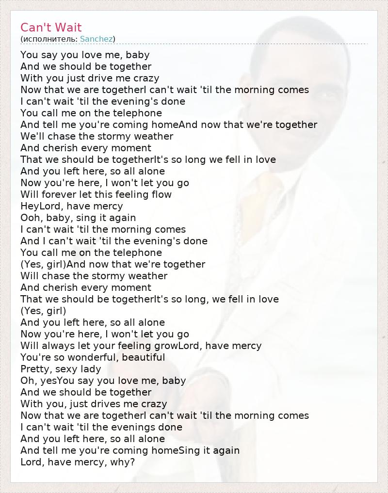 You say you love me, baby And we should be together With you just drive me crazy Now that we are togetherI can't wait 'til the morning comes I can't wait 'til the evening's done You call me on the telephone And tell me you're coming homeAnd now that we're together We'll chase the stormy weather And cherish every moment That we should be togetherIt's so long we fell in love And you left here, so all alone Now you're here, I won't let you go Will forever let this feeling flow HeyLord, have mercy Ooh, baby, sing it again I can't wait 'til the morning comes And I can't wait 'til the evening's done You call me on the telephone (Yes, girl)And now that we're together Will chase the stormy weather And cherish every moment That we should be togetherIt's so long, we fell in love (Yes, girl) And you left here, so all alone Now you're here, I won't let you go Will always let your feeling growLord, have mercy You're so wonderful, beautiful Pretty, sexy lady Oh, yesYou say you love me, baby And we should be together With you, just drives me crazy Now that we are togetherI can't wait 'til the morning comes I can't wait 'til the evenings done And you left here, so all alone And tell me you're coming homeSing it again Lord, have mercy, why?