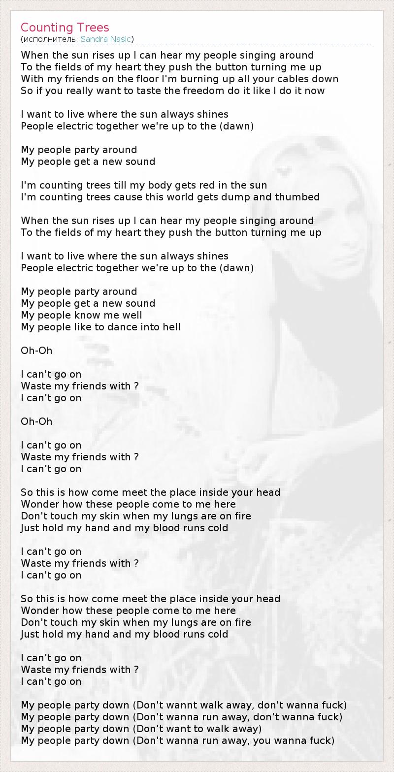When the sun rises up I can hear my people singing around To the fields of my heart they push the button turning me up With my friends on the floor I'm burning up all your cables down So if you really want to taste the freedom do it like I do it now I want to live where the sun always shines People electric together we're up to the (dawn) My people party around My people get a new sound I'm counting trees till my body gets red in the sun I'm counting trees cause this world gets dump and thumbed When the sun rises up I can hear my people singing around To the fields of my heart they push the button turning me up I want to live where the sun always shines People electric together we're up to the (dawn) My people party around My people get a new sound My people know me well My people like to dance into hell Oh-Oh I can't go on Waste my friends with ? I can't go on Oh-Oh I can't go on Waste my friends with ? I can't go on So this is how come meet the place inside your head Wonder how these people come to me here Don't touch my skin when my lungs are on fire Just hold my hand and my blood runs cold I can't go on Waste my friends with ? I can't go on So this is how come meet the place inside your head Wonder how these people come to me here Don't touch my skin when my lungs are on fire Just hold my hand and my blood runs cold I can't go on Waste my friends with ? I can't go on My people party down (Don't wannt walk away, don't wanna fuck) My people party down (Don't wanna run away, don't wanna fuck) My people party down (Don't want to walk away) My people party down (Don't wanna run away, you wanna fuck)