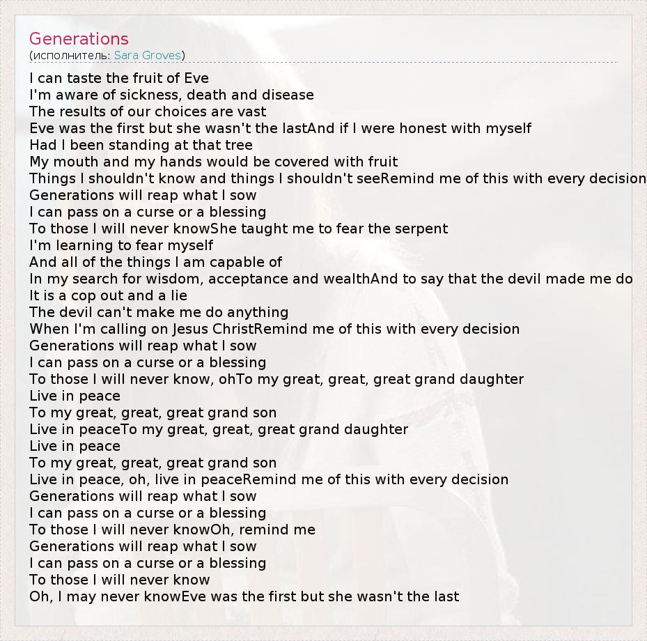 I can taste the fruit of Eve I'm aware of sickness, death and disease The results of our choices are vast Eve was the first but she wasn't the lastAnd if I were honest with myself Had I been standing at that tree My mouth and my hands would be covered with fruit Things I shouldn't know and things I shouldn't seeRemind me of this with every decision Generations will reap what I sow I can pass on a curse or a blessing To those I will never knowShe taught me to fear the serpent I'm learning to fear myself And all of the things I am capable of In my search for wisdom, acceptance and wealthAnd to say that the devil made me do It is a cop out and a lie The devil can't make me do anything When I'm calling on Jesus ChristRemind me of this with every decision Generations will reap what I sow I can pass on a curse or a blessing To those I will never know, ohTo my great, great, great grand daughter Live in peace To my great, great, great grand son Live in peaceTo my great, great, great grand daughter Live in peace To my great, great, great grand son Live in peace, oh, live in peaceRemind me of this with every decision Generations will reap what I sow I can pass on a curse or a blessing To those I will never knowOh, remind me Generations will reap what I sow I can pass on a curse or a blessing To those I will never know Oh, I may never knowEve was the first but she wasn't the last
