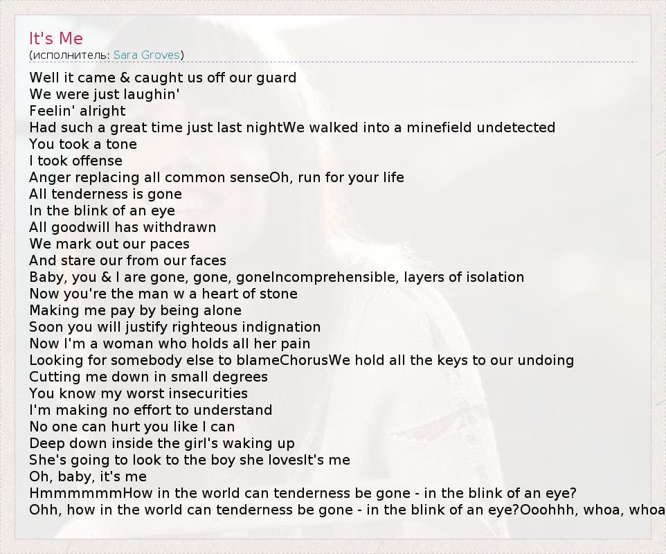 Well it came & caught us off our guard We were just laughin' Feelin' alright Had such a great time just last nightWe walked into a minefield undetected You took a tone I took offense Anger replacing all common senseOh, run for your life All tenderness is gone In the blink of an eye All goodwill has withdrawn We mark out our paces And stare our from our faces Baby, you & I are gone, gone, goneIncomprehensible, layers of isolation Now you're the man w a heart of stone Making me pay by being alone Soon you will justify righteous indignation Now I'm a woman who holds all her pain Looking for somebody else to blameChorusWe hold all the keys to our undoing Cutting me down in small degrees You know my worst insecurities I'm making no effort to understand No one can hurt you like I can Deep down inside the girl's waking up She's going to look to the boy she lovesIt's me Oh, baby, it's me HmmmmmmHow in the world can tenderness be gone - in the blink of an eye? Ohh, how in the world can tenderness be gone - in the blink of an eye?Ooohhh, whoa, whoa