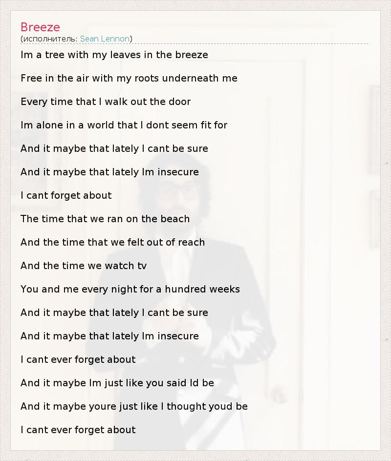 Im a tree with my leaves in the breeze Free in the air with my roots underneath me Every time that I walk out the door Im alone in a world that I dont seem fit for And it maybe that lately I cant be sure And it maybe that lately Im insecure I cant forget about The time that we ran on the beach And the time that we felt out of reach And the time we watch tv You and me every night for a hundred weeks And it maybe that lately I cant be sure And it maybe that lately Im insecure I cant ever forget about And it maybe Im just like you said Id be And it maybe youre just like I thought youd be I cant ever forget about