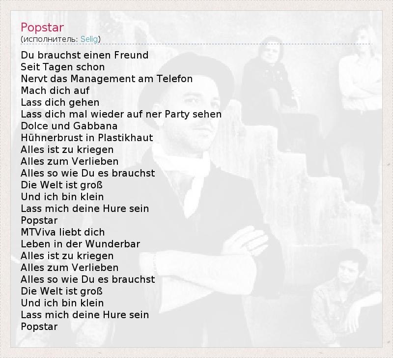 Du brauchst einen Freund Seit Tagen schon Nervt das Management am Telefon Mach dich auf Lass dich gehen Lass dich mal wieder auf ner Party sehen Dolce und Gabbana Hühnerbrust in Plastikhaut Alles ist zu kriegen Alles zum Verlieben Alles so wie Du es brauchst Die Welt ist groß Und ich bin klein Lass mich deine Hure sein Popstar MTViva liebt dich Leben in der Wunderbar Alles ist zu kriegen Alles zum Verlieben Alles so wie Du es brauchst Die Welt ist groß Und ich bin klein Lass mich deine Hure sein Popstar