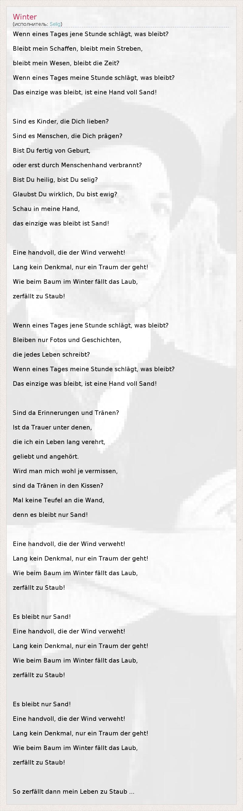 Это интересно:Selig была основана в 1993 году в Гамбурге, Германия. Первоначально членами группы были вокалист Jan Plewka, басист Leo Schmidthals, гитарист Christian Neander, барабанщик Stephan “Stoppel” Eggert и клавишник Malte Неймана. Их первый гранж-альбом "Selig", с элементами хиппи, был выпущен в 1994 году. Песни Sie hat geschrien” и “Wenn ich wollte” вошли в немецкие хит-парады практически сразу. В 1995 году появился второй альбом “Hier”.... продолжение