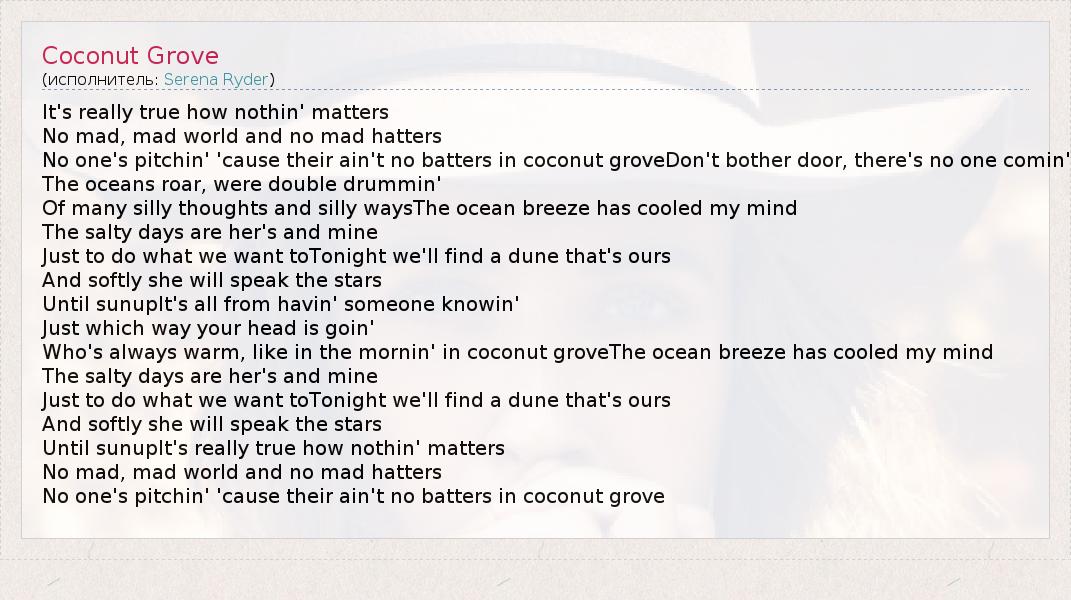 А как ты думаешь, о чем песня "Coconut Grove" ?
