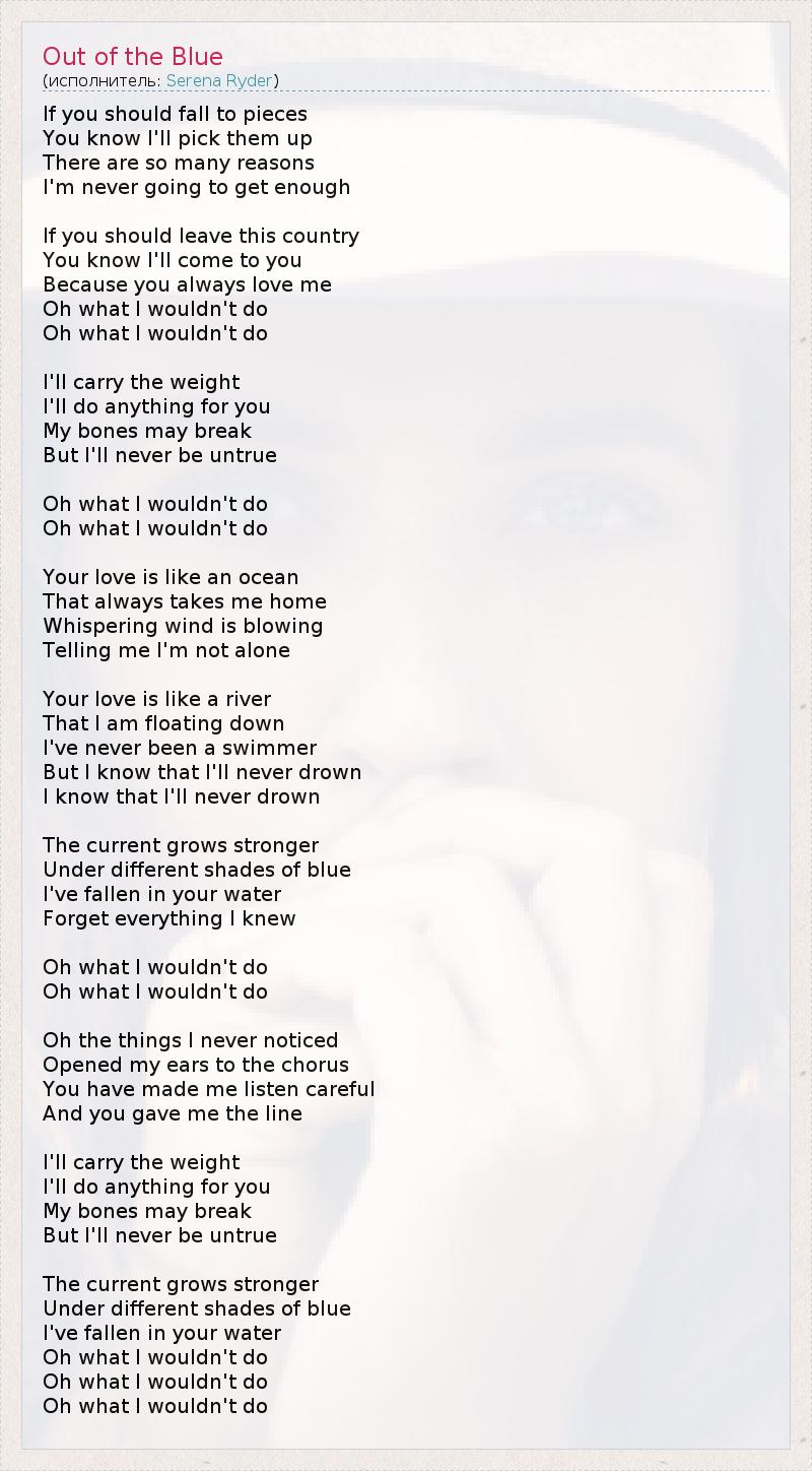 If you should fall to pieces You know I'll pick them up There are so many reasons I'm never going to get enough If you should leave this country You know I'll come to you Because you always love me Oh what I wouldn't do Oh what I wouldn't do I'll carry the weight I'll do anything for you My bones may break But I'll never be untrue Oh what I wouldn't do Oh what I wouldn't do Your love is like an ocean That always takes me home Whispering wind is blowing Telling me I'm not alone Your love is like a river That I am floating down I've never been a swimmer But I know that I'll never drown I know that I'll never drown The current grows stronger Under different shades of blue I've fallen in your water Forget everything I knew Oh what I wouldn't do Oh what I wouldn't do Oh the things I never noticed Opened my ears to the chorus You have made me listen careful And you gave me the line I'll carry the weight I'll do anything for you My bones may break But I'll never be untrue The current grows stronger Under different shades of blue I've fallen in your water Oh what I wouldn't do Oh what I wouldn't do Oh what I wouldn't do