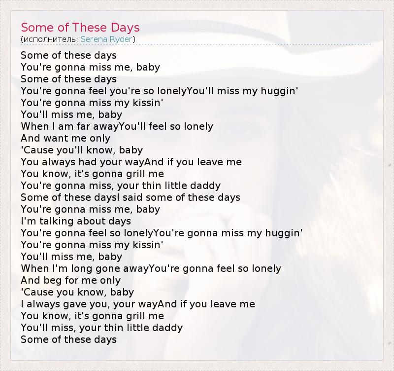 Some of these days You're gonna miss me, baby Some of these days You're gonna feel you're so lonelyYou'll miss my huggin' You're gonna miss my kissin' You'll miss me, baby When I am far awayYou'll feel so lonely And want me only 'Cause you'll know, baby You always had your wayAnd if you leave me You know, it's gonna grill me You're gonna miss, your thin little daddy Some of these daysI said some of these days You're gonna miss me, baby I'm talking about days You're gonna feel so lonelyYou're gonna miss my huggin' You're gonna miss my kissin' You'll miss me, baby When I'm long gone awayYou're gonna feel so lonely And beg for me only 'Cause you know, baby I always gave you, your wayAnd if you leave me You know, it's gonna grill me You'll miss, your thin little daddy Some of these days