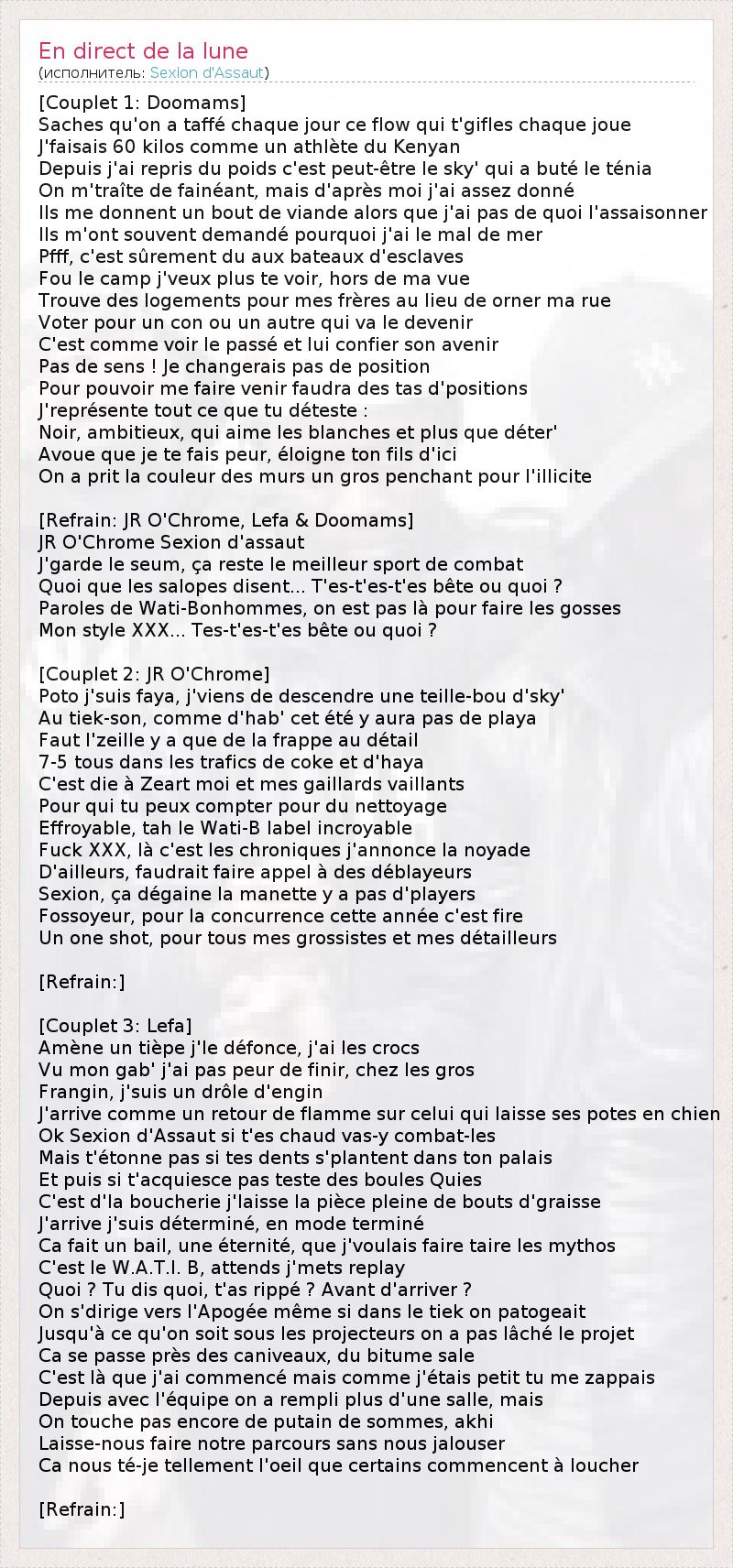 [Couplet 1: Doomams] Saches qu'on a taffé chaque jour ce flow qui t'gifles chaque joue J'faisais 60 kilos comme un athlète du Kenyan Depuis j'ai repris du poids c'est peut-être le sky' qui a buté le ténia On m'traîte de fainéant, mais d'après moi j'ai assez donné Ils me donnent un bout de viande alors que j'ai pas de quoi l'assaisonner Ils m'ont souvent demandé pourquoi j'ai le mal de mer Pfff, c'est sûrement du aux bateaux d'esclaves Fou le camp j'veux plus te voir, hors de ma vue Trouve des logements pour mes frères au lieu de orner ma rue Voter pour un con ou un autre qui va le devenir C'est comme voir le passé et lui confier son avenir Pas de sens ! Je changerais pas de position Pour pouvoir me faire venir faudra des tas d'positions J'représente tout ce que tu déteste : Noir, ambitieux, qui aime les blanches et plus que déter' Avoue que je te fais peur, éloigne ton fils d'ici On a prit la couleur des murs un gros penchant pour l'illicite [Refrain: JR O'Chrome, Lefa & Doomams] JR O'Chrome Sexion d'assaut J'garde le seum, ça reste le meilleur sport de combat Quoi que les salopes disent... T'es-t'es-t'es bête ou quoi ? Paroles de Wati-Bonhommes, on est pas là pour faire les gosses Mon style XXX... Tes-t'es-t'es bête ou quoi ? [Couplet 2: JR O'Chrome] Poto j'suis faya, j'viens de descendre une teille-bou d'sky' Au tiek-son, comme d'hab' cet été y aura pas de playa Faut l'zeille y a que de la frappe au détail 7-5 tous dans les trafics de coke et d'haya C'est die à Zeart moi et mes gaillards vaillants Pour qui tu peux compter pour du nettoyage Effroyable, tah le Wati-B label incroyable Fuck XXX, là c'est les chroniques j'annonce la noyade D'ailleurs, faudrait faire appel à des déblayeurs Sexion, ça dégaine la manette y a pas d'players Fossoyeur, pour la concurrence cette année c'est fire Un one shot, pour tous mes grossistes et mes détailleurs [Refrain:] [Couplet 3: Lefa] Amène un tièpe j'le défonce, j'ai les crocs Vu mon gab' j'ai pas peur de finir, chez les gros Frangin, j'suis un drôle d'engin J'arrive comme un retour de flamme sur celui qui laisse ses potes en chien Ok Sexion d'Assaut si t'es chaud vas-y combat-les Mais t'étonne pas si tes dents s'plantent dans ton palais Et puis si t'acquiesce pas teste des boules Quies C'est d'la boucherie j'laisse la pièce pleine de bouts d'graisse J'arrive j'suis déterminé, en mode terminé Ca fait un bail, une éternité, que j'voulais faire taire les mythos C'est le W.A.T.I. B, attends j'mets replay Quoi ? Tu dis quoi, t'as rippé ? Avant d'arriver ? On s'dirige vers l'Apogée même si dans le tiek on patogeait Jusqu'à ce qu'on soit sous les projecteurs on a pas lâché le projet Ca se passe près des caniveaux, du bitume sale C'est là que j'ai commencé mais comme j'étais petit tu me zappais Depuis avec l'équipe on a rempli plus d'une salle, mais On touche pas encore de putain de sommes, akhi Laisse-nous faire notre parcours sans nous jalouser Ca nous té-je tellement l'oeil que certains commencent à loucher [Refrain:]