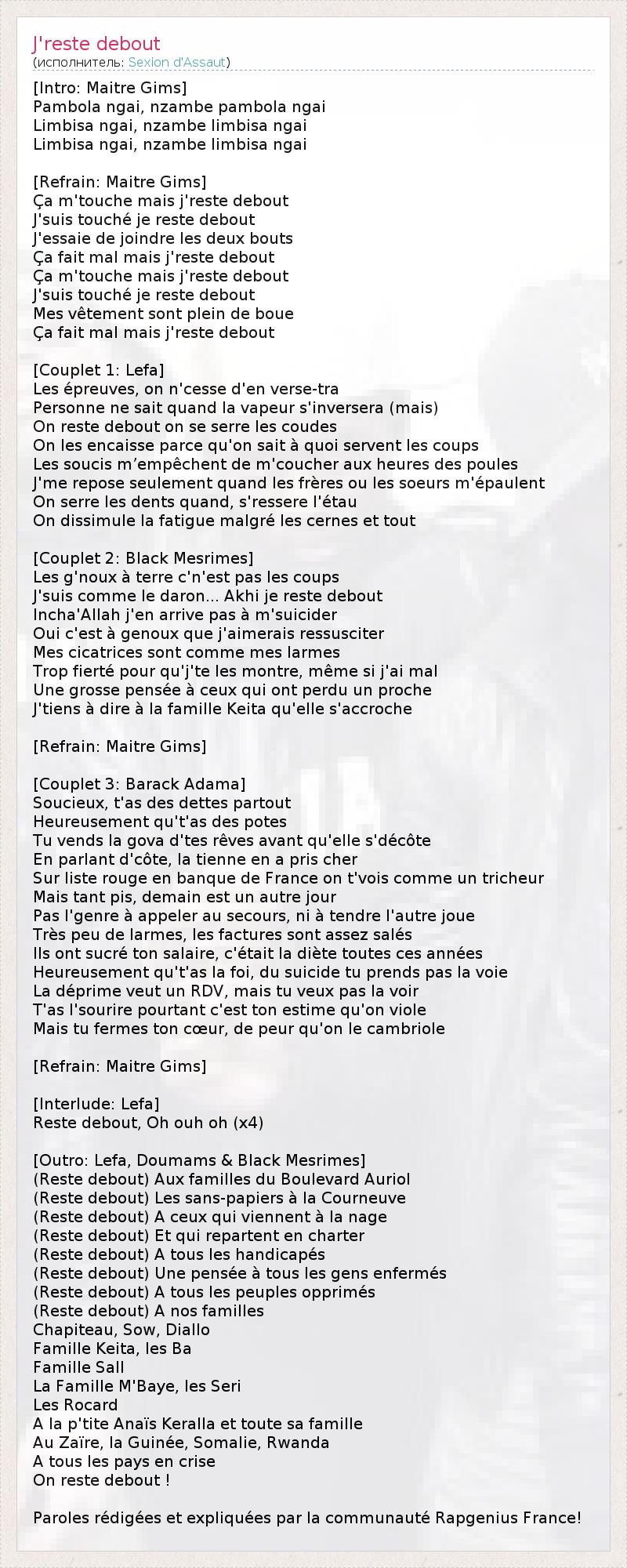 [Intro: Maitre Gims] Pambola ngai, nzambe pambola ngai Limbisa ngai, nzambe limbisa ngai Limbisa ngai, nzambe limbisa ngai [Refrain: Maitre Gims] Ça m'touche mais j'reste debout J'suis touché je reste debout J'essaie de joindre les deux bouts Ça fait mal mais j'reste debout Ça m'touche mais j'reste debout J'suis touché je reste debout Mes vêtement sont plein de boue Ça fait mal mais j'reste debout [Couplet 1: Lefa] Les épreuves, on n'cesse d'en verse-tra Personne ne sait quand la vapeur s'inversera (mais) On reste debout on se serre les coudes On les encaisse parce qu'on sait à quoi servent les coups Les soucis m’empêchent de m'coucher aux heures des poules J'me repose seulement quand les frères ou les soeurs m'épaulent On serre les dents quand, s'ressere l'étau On dissimule la fatigue malgré les cernes et tout [Couplet 2: Black Mesrimes] Les g'noux à terre c'n'est pas les coups J'suis comme le daron... Akhi je reste debout Incha'Allah j'en arrive pas à m'suicider Oui c'est à genoux que j'aimerais ressusciter Mes cicatrices sont comme mes larmes Trop fierté pour qu'j'te les montre, même si j'ai mal Une grosse pensée à ceux qui ont perdu un proche J'tiens à dire à la famille Keita qu'elle s'accroche [Refrain: Maitre Gims] [Couplet 3: Barack Adama] Soucieux, t'as des dettes partout Heureusement qu't'as des potes Tu vends la gova d'tes rêves avant qu'elle s'décôte En parlant d'côte, la tienne en a pris cher Sur liste rouge en banque de France on t'vois comme un tricheur Mais tant pis, demain est un autre jour Pas l'genre à appeler au secours, ni à tendre l'autre joue Très peu de larmes, les factures sont assez salés Ils ont sucré ton salaire, c'était la diète toutes ces années Heureusement qu't'as la foi, du suicide tu prends pas la voie La déprime veut un RDV, mais tu veux pas la voir T'as l'sourire pourtant c'est ton estime qu'on viole Mais tu fermes ton cœur, de peur qu'on le cambriole [Refrain: Maitre Gims] [Interlude: Lefa] Reste debout, Oh ouh oh (x4) [Outro: Lefa, Doumams & Black Mesrimes] (Reste debout) Aux familles du Boulevard Auriol (Reste debout) Les sans-papiers à la Courneuve (Reste debout) A ceux qui viennent à la nage (Reste debout) Et qui repartent en charter (Reste debout) A tous les handicapés (Reste debout) Une pensée à tous les gens enfermés (Reste debout) A tous les peuples opprimés (Reste debout) A nos familles Chapiteau, Sow, Diallo Famille Keita, les Ba Famille Sall La Famille M'Baye, les Seri Les Rocard A la p'tite Anaïs Keralla et toute sa famille Au Zaïre, la Guinée, Somalie, Rwanda A tous les pays en crise On reste debout ! Paroles rédigées et expliquées par la communauté Rapgenius France!
